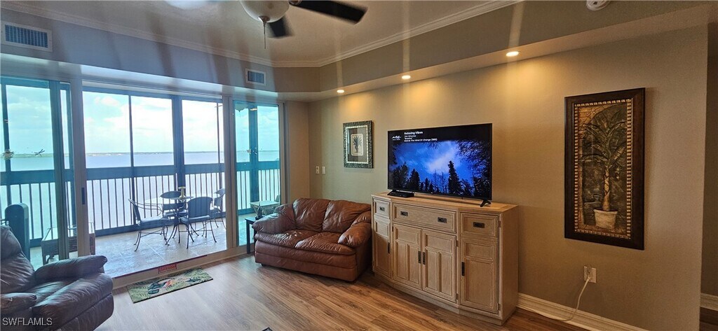 Ask about summer specials! Kick your feet up and relax at home on the 8th floor,the perfect height for dolphin watching and seeing the gorgeous views as boats go up and down the Caloosahatchee River. The view is a must see all day and even more spectacular at night. 2 MASTER BEDROOMS & 2 COVERED GARAGE PARKING SPACES INCLUDED. Watch the city come to life from the pool deck as it lights up near the River District. The Edison bridges are illuminated by cars crossing over. The condo features 2 MASTER SUITES with a guest access bath door. The main master bedroom has a separate sliding door to the lanai. Featuring an open kitchen and natural lighting from the large sliding doors in both the living area and master bedroom. These doors open into a completely private screened lanai with acrylic sliding windows that allow you to enjoy it during all seasons. New vinal wood flooring throughout the living and bedrooms while the kitchen and hall have tile for an easy clean,3 large screen TVs,ceiling fans in every room. The luxury community has many amenities,including a gym,heated pool,sauna and a billiards room,tennis and pickleball courts on the roof of the parking garage,secure bike storage room,and outdoor grills. Public boat ramp nearby,many area golf courses. The building is just a short walk from the downtown Historic District or take the free trolly in season to the many restaurants,library,museums,theaters and shopping. That’s not it,for your safety the building is secure,and the grounds and parking are gated. There is a receptionist to greet you during daytime hours. Ask about discounts for stays of 6 month or longer with no 11.5% Florida sales tax. Call for seasonal details and availability! Nov-Jan $3500 plus FL tourist tax. Monthly rate price for 6 months or longer.