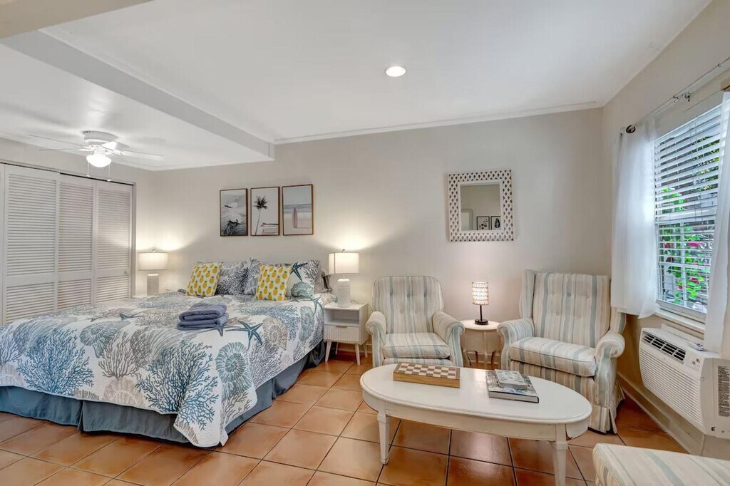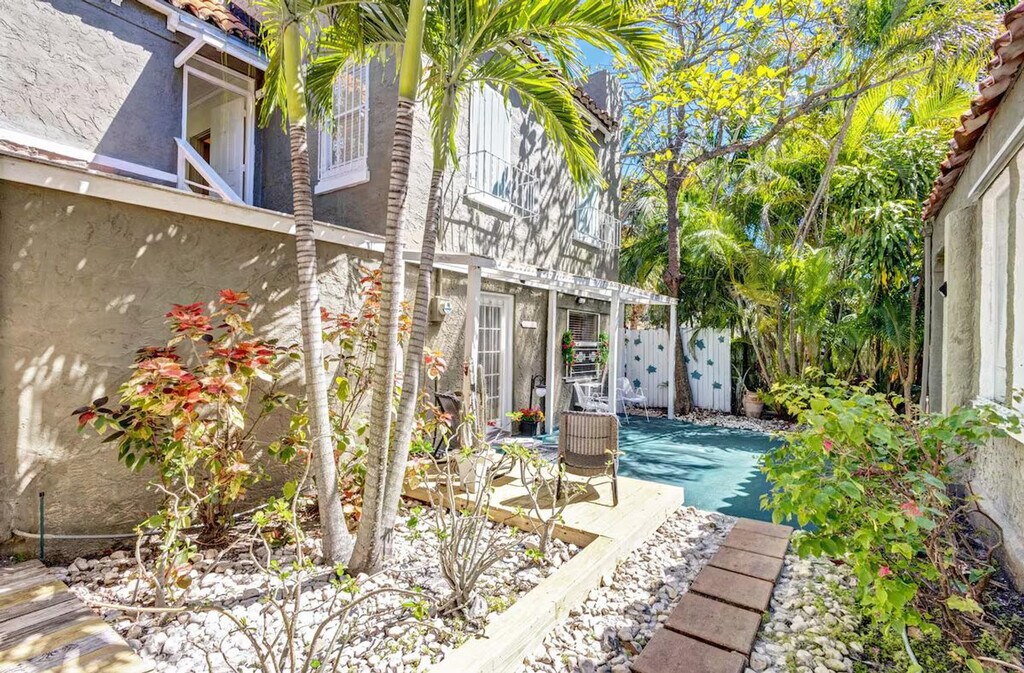 Feel at home in this lovely studio apartment in the garden unit (ground floor) of a historic 1920s house in the highly sought-after Old Northwood neighborhood in West Palm Beach. The apartment has been completely renovated and freshly painted, and it features a newly remodeled full bathroom with both a tub and a shower. There's a quaint kitchenette equipped with a small fridge, coffeemaker, toaster grill, and microwave. High-speed internet is included. A shared washer and dryer are available on the property and shared with the tenants in the unit above. Enjoy morning coffee in your private patio surrounded by a spectacular garden with old palm trees and fruit trees. Please note that there is no full kitchen. The house is situated in historic Old Northwood (corner of 28th and Spruce), near the end of a quiet cul-de-sac in a prime location. It's a very short drive across the bridge to Palm Beach, Worth Avenue, the Atlantic beaches and to downtown West Palm Beach. The airport is a short 10-minute drive, and it is a 5-minute drive to the train station (Brightline to Tri-Rail to Miami or Fort Lauderdale). It's easy walking distance to the intracoastal waterway, the Palm Beach Maritime Museum (from where you can take a water taxi to Peanut Island) and the Currie Park with its bike paths, tennis courts and phantastic views. Within two miles you will find City Place with its shopping, restaurants, theaters, sidewalk cafes, nightclubs and boutiques; Clematis Street's shopping and nightlife, the Kravis Center for the performing Arts, the Norton Museum and the Palm Beach County Convention Center. The vibrant shopping area of Northwood Village is four blocks away, where streets are lined with antique stores, a yoga studio and tons of restaurants. Quiet hours are from 10:00 pm to 6:00 am. There is a strict no pet policy. Registration Number: 000032495, [SI]