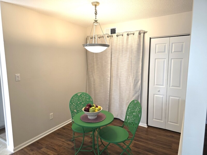 Rose TurcoGreat 2 bedroom, 2 full bath second-floor walk-up condo in a prime location near shopping, major highways, and just 0.7 miles from Rex Hospital. Ideal roommate floor plan with two separate full bathrooms. Features include a dining area, spacious kitchen, and living room with wood-burning fireplace. Large private deck overlooks natural wooded surroundings in a quiet, peaceful subdivision. Freshly painted with new LVP flooring and ceiling fans. Washer and dryer included. Pet friendly.