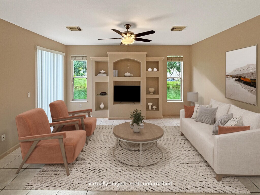 Step into this bright and spacious 3-bedroom, 2.5-bath home offering over 2,013 sq ft of comfortable living in a quiet Port St. Lucie neighborhood. With fresh paint, vaulted ceilings, and tile flooring throughout the main living areas, this home feels clean, open, and inviting the moment you arrive. The open-concept layout gives you plenty of room to relax or entertain. The kitchen features classic wooden cabinetry and a functional layout with all appliances included. The primary suite offers generous space with a walk-in closet and private bath, while the additional bedrooms provide flexibility for family, work, or guests. A dedicated inside laundry room with washer and dryer adds everyday convenience. Enjoy Florida living from the screened-in lanai overlooking a peaceful backyard with mature trees — perfect for morning coffee or unwinding after work. An attached garage provides secure parking and extra storage. Location: Just minutes from shopping, dining, parks, and easy access to Crosstown Parkway, this home delivers comfort, space, and convenience in one. Move-in ready and available now. Home Highlights: • 3 bedrooms, 2.5 baths • 2,013 sq ft • Vaulted ceilings + open layout • Tile in living areas; carpet in bedrooms • Inside laundry with washer/dryer • Screened lanai + peaceful backyard • Attached garage • Fresh paint throughout • Move-in ready This house is unfurnished - Furnishings in photos shown for effect only. Rental Details: *Lease Term: 12+ months *Availability: ASAP *Pets: Dogs allowed. Pet application fee and monthly fees apply. Application Info: *$65 application fee per adult (non-refundable) *1–3 business-day processing *Minimum credit score 650 (co-signer may be required) *No smoking Important Notice: Beware of scammers! PMI Palm Properties is the only authorized leasing agent. We never request wire transfers or lease directly through owners. We do not list on Craigslist or Facebook Marketplace. Upon approval tenants will be subject to a $150 one-time tenant set up fee. Tenant Benefit Package: $49.95 monthly Tenant benefit package which includes- Monthly HVAC Filters, Pest Control, Renters Insurance (all 3 are needed for lease compliance) and bonus $1M Identity Theft Protection, Credit Building, and a Resident Rewards Program.