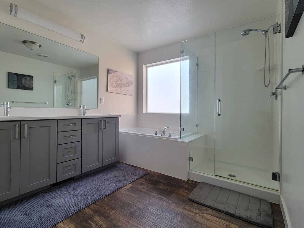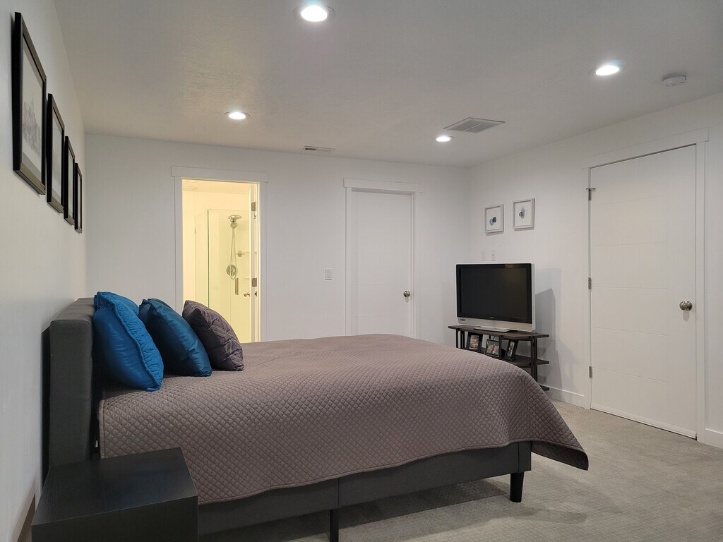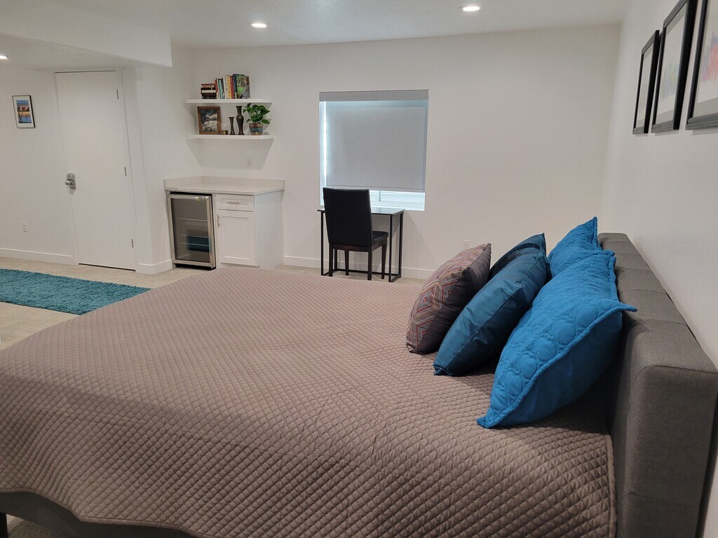 Spacious, modern, and thoughtfully upgraded this stunning 4-bedroom, 3.5-bath single-family home in Vineyard offers comfort, flexibility, and premium finishes throughout. Over 2,600 sqft living space, largest lot in the neighborhood, and only one adjacent neighbor! Single family home with 4 bedrooms and a separate office along with 3.5 bathrooms available for rent in January 2026. Near Trailside Elementary School, walking distance to 3 parks, and includes free access to 2 HOA clubhouses with gym, pool, hot tub, and recreation rooms. Three upstairs bedrooms with natural light and mountain views including a large primary bedroom with large bathroom and walk-in closet. Fully finished basement features the fourth bedroom/primary bedroom/living space and has a large bathroom with ample storage and two closets, a small refrigerator, second stackable washer/dryer hook-up, cold storage, and a small bonus room with a door that can be used as an office, workout space, extra storage, or playroom. Additional features: * Paid solar panels * Nest Bluetooth thermostat * Ring Bluetooth monitoring * Keypad for keyless front door and garage access * Mudroom and storage area from garage entry * Upgraded GE kitchen appliances * Samsung washer and dryer included * Basement refrigerator included * Water softener system in whole house * Premium fixtures and finishes * Parking for four cars: two-car garage and two cars in driveway