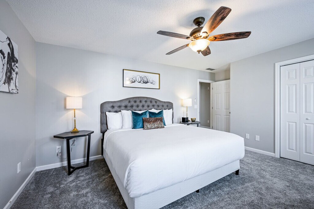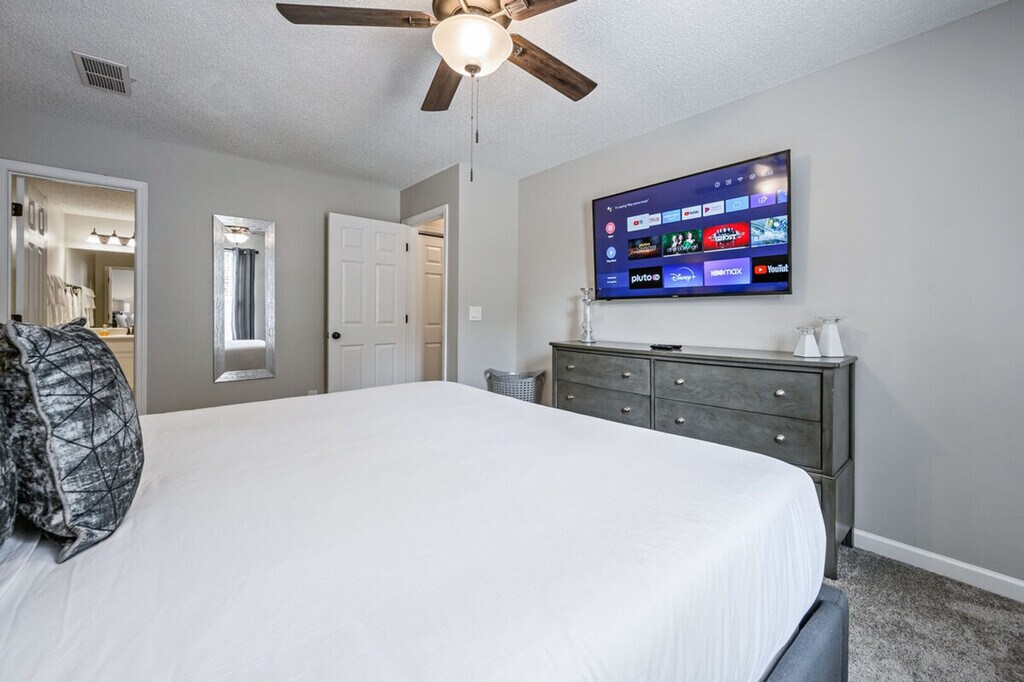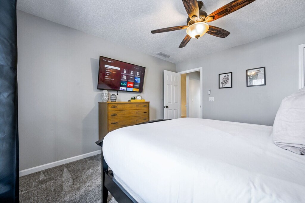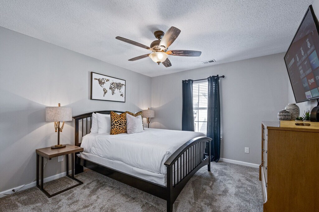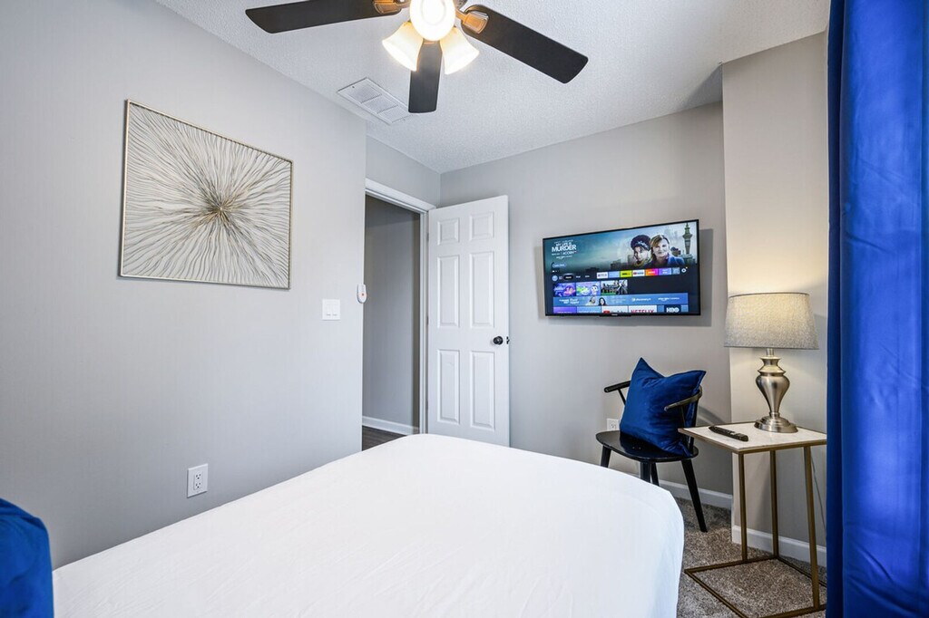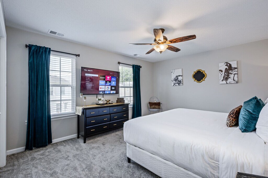 Feel at home in this 4-bedroom, 2-bathroom residence, perfectly situated just minutes from Cartersville Medical Center, Bartow Marketplace, and LakePoint Sports Complex. This home offers a seamless blend of comfort and convenience, ideal for work trips, relocations, or family visits. Inside, the master suite on the main floor features a king-size bed and a private bathroom. Upstairs, you'll find a king bedroom, a queen bedroom, and a twin bedroom, comfortably accommodating up to 7 guests. Each room is equipped with smart TVs, blackout curtains, and hotel-quality linens. The cozy living room is perfect for relaxing or streaming, while the fully equipped kitchen comes with cookware, kitchenware, and cooking basics. A full-size washer and dryer are available in the laundry closet, and high-speed WiFi is accessible throughout the home. Pets are welcome with applicable fees. Onsite parking details are shared upon booking. Extended-stay cleaning costs apply, with a mid-stay clean required for stays of 40–60 nights and a deep clean for stays over 60 nights. Additional charges for cleaning and restocking are separate from the standard cleaning fee. This centrally located Cartersville home is just minutes from Cartersville Medical Center and Bartow Marketplace. Enjoy proximity to museums, local dining, and the LakePoint Sports Complex, making it a great choice for traveling workers, relocations, or long-term stays. This is a non-smoking property and no events are allowed. Pets require approval before check-in, with fees collected based on the length of stay. The house is fully move-in ready with no hidden fees, and you'll have the entire house to yourself during your stay.