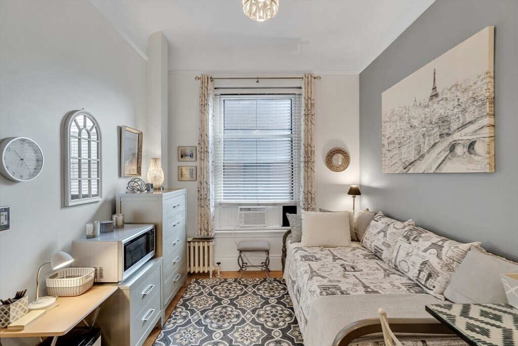Charming,fully furnished studio in a classic Back Bay brownstone located directly across from the Commonwealth Mall. Unit 8 is reached by one flight of stairs or by elevator from an elegant lobby with keyless LATCH entry. This efficiently designed home features 10’+ ceilings,wood floors,a renovated marble-tiled bathroom with a modern shower,and a kitchenette with a 4-burner gas range,mini refrigerator/freezer,and sink. A great option for a professional or anyone seeking a convenient in-town residence in one of Boston’s most desirable neighborhoods. Close to Newbury Street,the Public Garden,Prudential Center,and MBTA access. Offered fully furnished with bed,mattress,linens,towels,table and chairs,pots and pans,window AC,and modem. Move-in ready as shown. Heat and hot water included; tenant pays electricity,gas for cooking,and cable/wifi. MLS# 73459740
