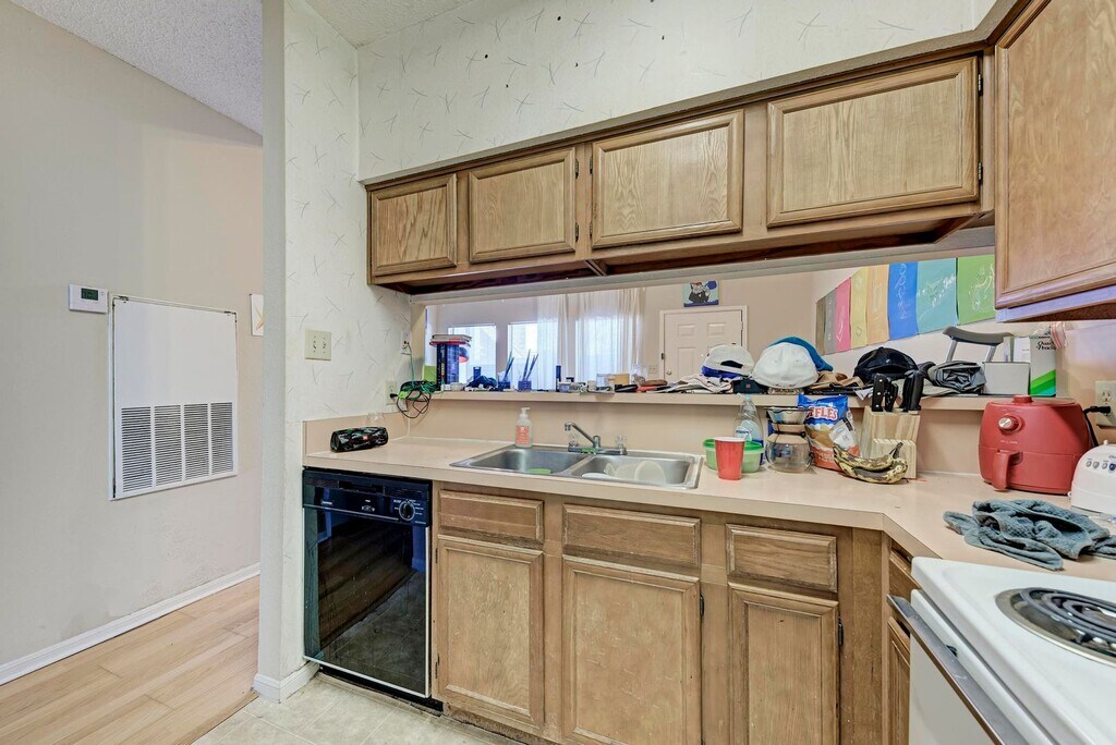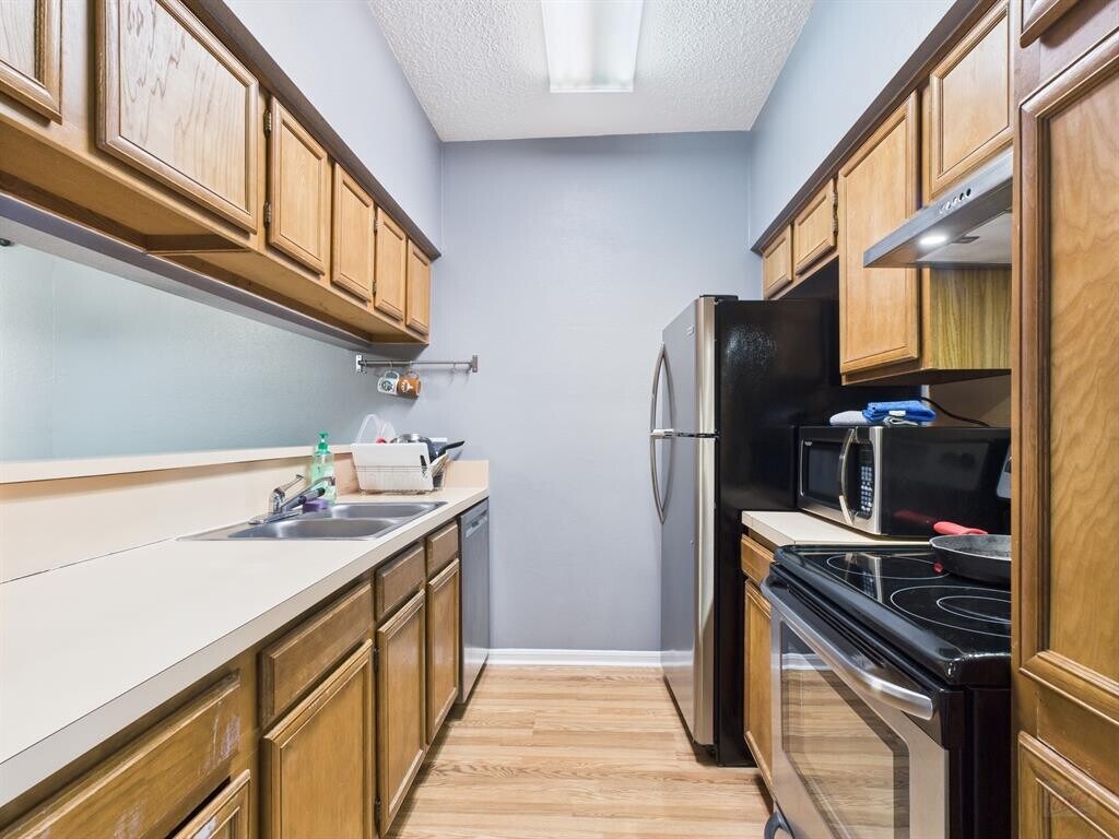 Be in one of the closest buildings to The University of Texas! This one-bedroom, one-bath condo is a block or two from the UT Campus with views of the Law School and Engineering School from the complex. A combined living and dining room has high ceilings and a fireplace. The kitchen has been completely remodeled and bran new appliances. Includes a beautiful breakfast bar, refrigerator, range, dishwasher, disposal and microwave. The laundry closet, equipped with a washer and dryer, is adjacent to the kitchen. The large bedroom features a LARGE walk-in closet, high ceilings, ceiling fan and direct access to a patio with a storage area. There is one reserved parking space in the community garage as well as guest parking. Feel safe as the condo has gated access. Located just steps away from popular spots like Taco Joint, Posse East, and Crown & Anchor. Bus route is across the street. In addition to the brand new appliances and kitchen remodel, recent improvements to the condo include interior paint and laminate floors. Available for August 2026 Pre-Lease. Schedule a showing today!