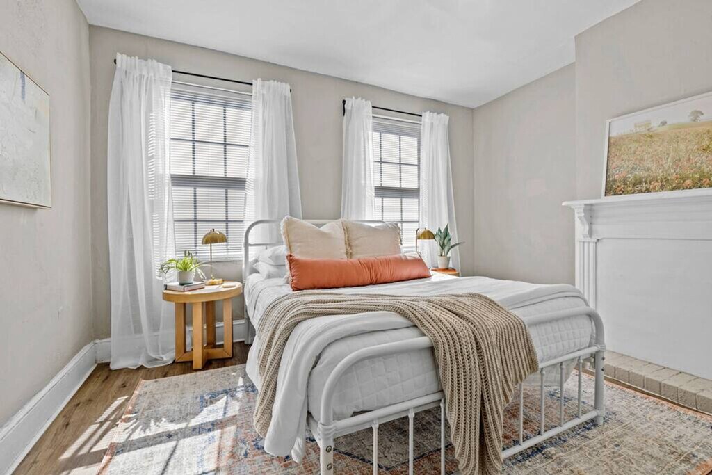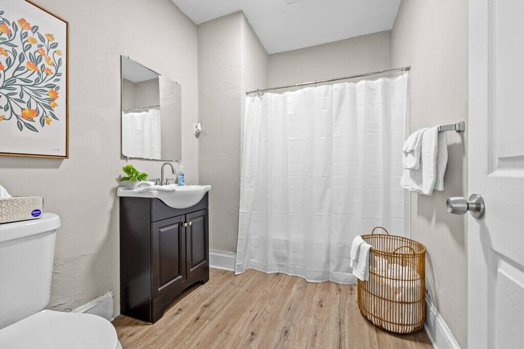 Welcome to this 2-bedroom duplex in Portsmouth, Virginia, offering 950 sq ft of living space. Feel at home in this kid-friendly apartment. The apartment features a large, fully equipped kitchen for cooking. The living room has seating for 6 and a smart TV for you to log in to your favorite streaming services. Each bedroom is equipped with memory foam mattresses, white noise machines, and blackout curtains for a cozy sleep. The bathroom is a shower tub combo with all the essentials. Parking is available for one car on-site, with additional street parking available. Located in Brighton Portsmouth, the apartment is directly adjacent to the naval shipyard. The neighborhood is an eclectic mix of industrial, residential, and business properties. While restaurants and entertainment in the immediate area are sparse, the neighborhood is ten minutes from downtown Portsmouth, an artsy area with a wide variety of restaurants and entertainment. It's a 5-minute walk to the Portsmouth Shipyard, a 10-minute drive to downtown restaurants and the Naval Medical Center, a 15-minute drive to downtown Norfolk, a 20-minute drive to outlet shopping and Ocean View beach, and a 30-minute drive to Virginia Beach. Public transportation is readily available, with the Hampton Roads Transit (HRT) bus system serving the area and the Portsmouth Transit Center providing connections to other parts of the region. Historic Olde Towne Portsmouth, the Naval Shipyard Museum, and the Portsmouth City Park are all within easy reach. Quiet hours are between 10 PM and 8 AM. Pets are not allowed, and evidence of pets will incur additional cleaning fees. Smoking or vaping inside the house or on the property will result in a $200 fine. No confetti or glitter; if found, it will incur additional cleaning fees. [SI]