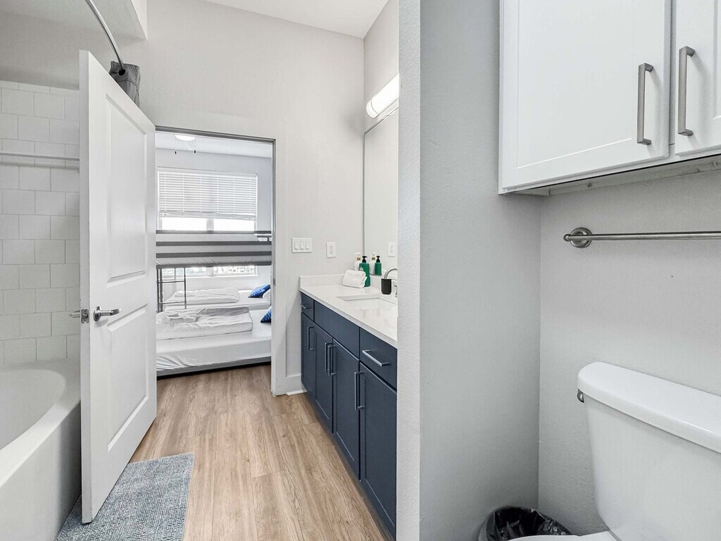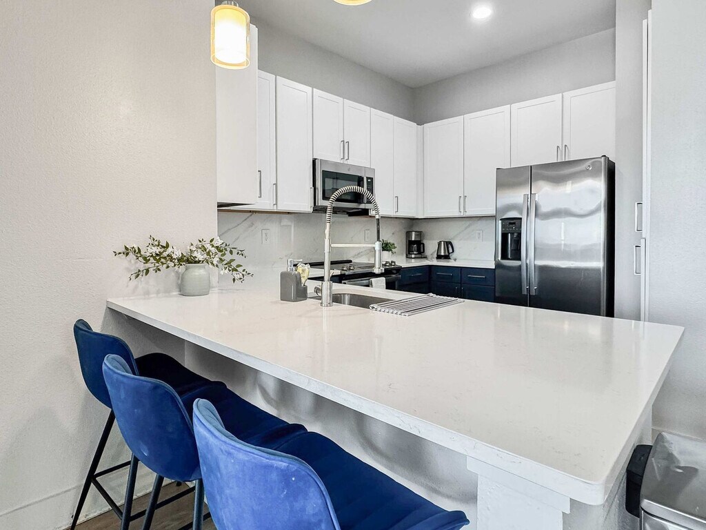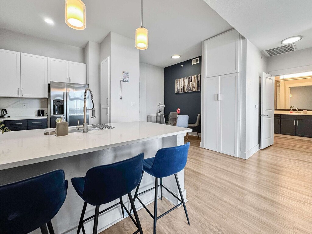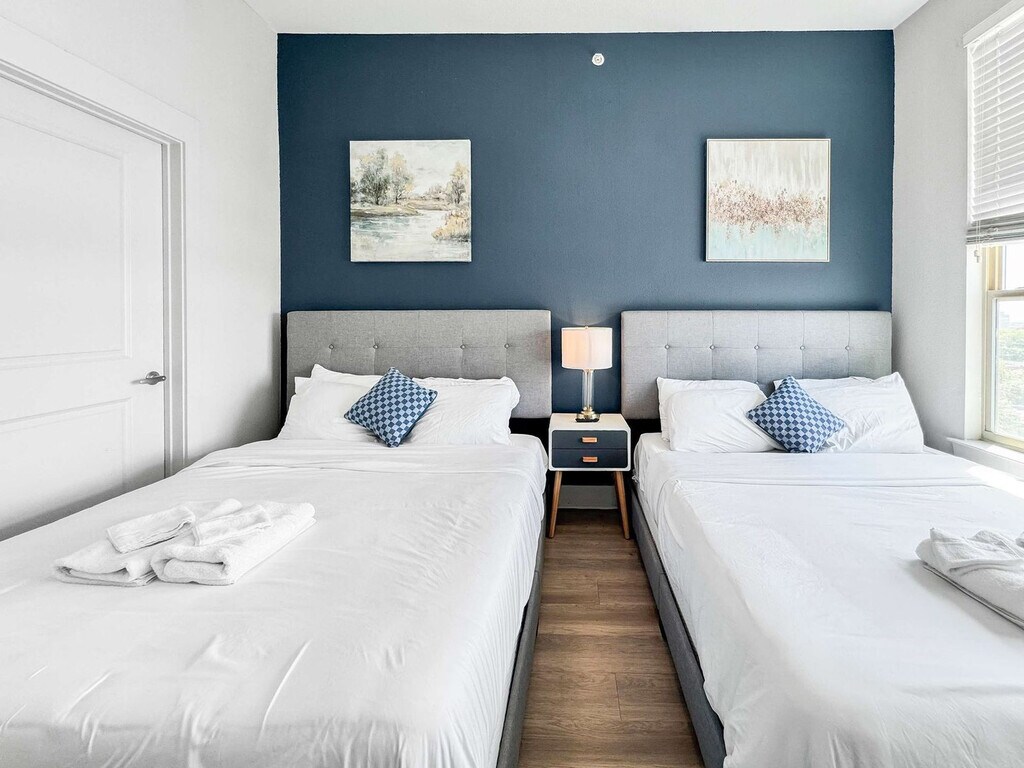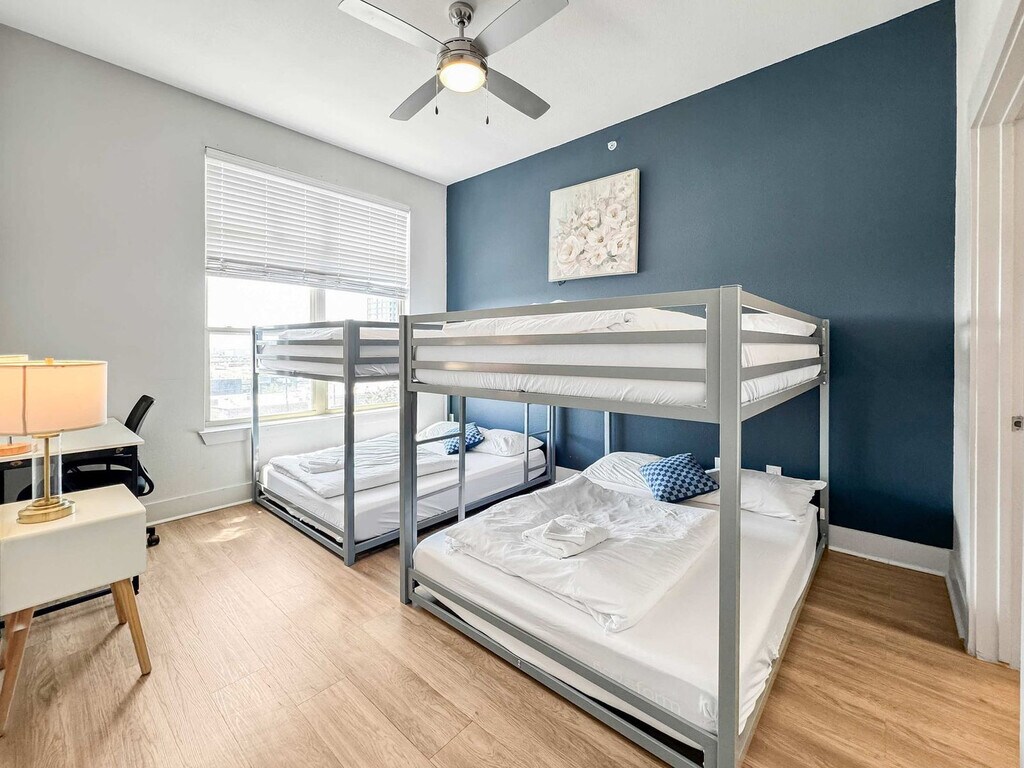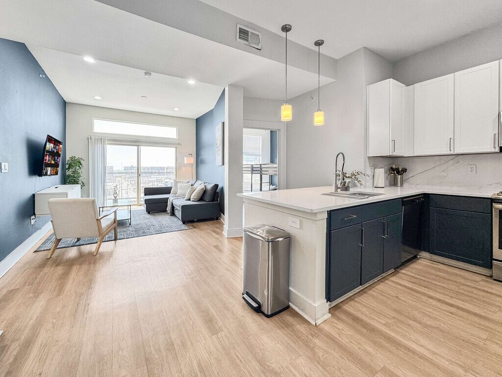 Located in the vibrant heart of Deep Ellum, this Dallas retreat offers the perfect blend of comfort and convenience. Modern, spotless, and complete with high-speed Wi-Fi, the space is designed for both relaxation and productivity. Rest easy in a plush queen bed and take in breathtaking views of Downtown Dallas. With top restaurants, lively nightlife, cultural museums, and green parks nearby, the location is unmatched. Skip the usual hotel rooms and standard rentals and feel at home here today. This bright and spacious 2-bedroom, 2-bathroom getaway is thoughtfully designed for comfort and style, offering everything needed for a stress-free and enjoyable stay. The open-plan living and dining area features sleek lighting and contemporary décor, creating a chic yet welcoming vibe. Each bedroom serves as a private haven, with large windows that fill the space with natural light and showcase beautiful evening views. Warm wooden floors and elegant finishes add to the inviting atmosphere. The living room includes a sofa bed and chair with a coffee table, and a 65” 4K HDR Smart TV with Netflix. Bedroom 1 features two queen beds with premium foam mattresses and linens, a 50” 4K HDR Smart TV with Netflix, a walk-in closet, reading lamps, and a work desk and chair. Bedroom 2 offers two full-size bunk beds with luxury foam mattresses and linens and a walk-in closet. Both bathrooms are fully stocked for convenience, featuring a shower and bathtub combo, wash basin, mirror, toilet, towels, and essential toiletries. The kitchen is fully stocked with a stove, oven, refrigerator/freezer, dishwasher, coffee maker, water kettle, and sink with hot and cold water, along with glassware, cutlery, pots, and pans. Pets are welcome based on size, with a pet cleaning fee of $25 per night for 1–4 nights, $200 total for 5–29 nights, and $300 total for 30+ nights. Situated in the heart of Deep Ellum, this apartment is surrounded by top restaurants, lively nightlife, cultural museums, and green parks, making it an ideal location for exploring Dallas. The neighborhood offers unmatched convenience and vibrant city life, ensuring a memorable stay. Guest verification is required before check-in, including providing a valid government-issued photo ID, confirmation of contact details, secure portal verification, and in some cases, a background check. Information is used only for screening and never stored beyond verification. Guests must sign a rental agreement upon reservation approval, agreeing to rental terms and conditions, submitting a valid ID before check-in, and completing the verification process to receive check-in details. Verification must be completed within 24 hours of booking or 1 hour for same-day reservations. Failure to complete may result in cancellation. For your safety, the property includes hallway security cameras and a Minut device monitoring indoor noise levels. [SI]