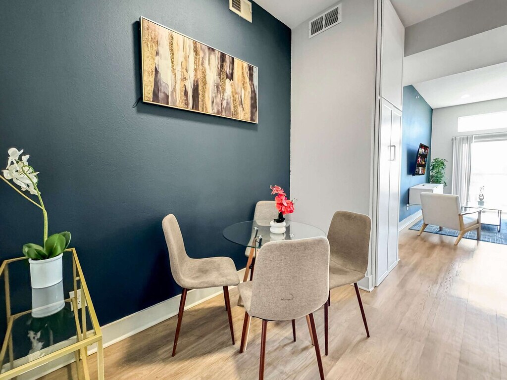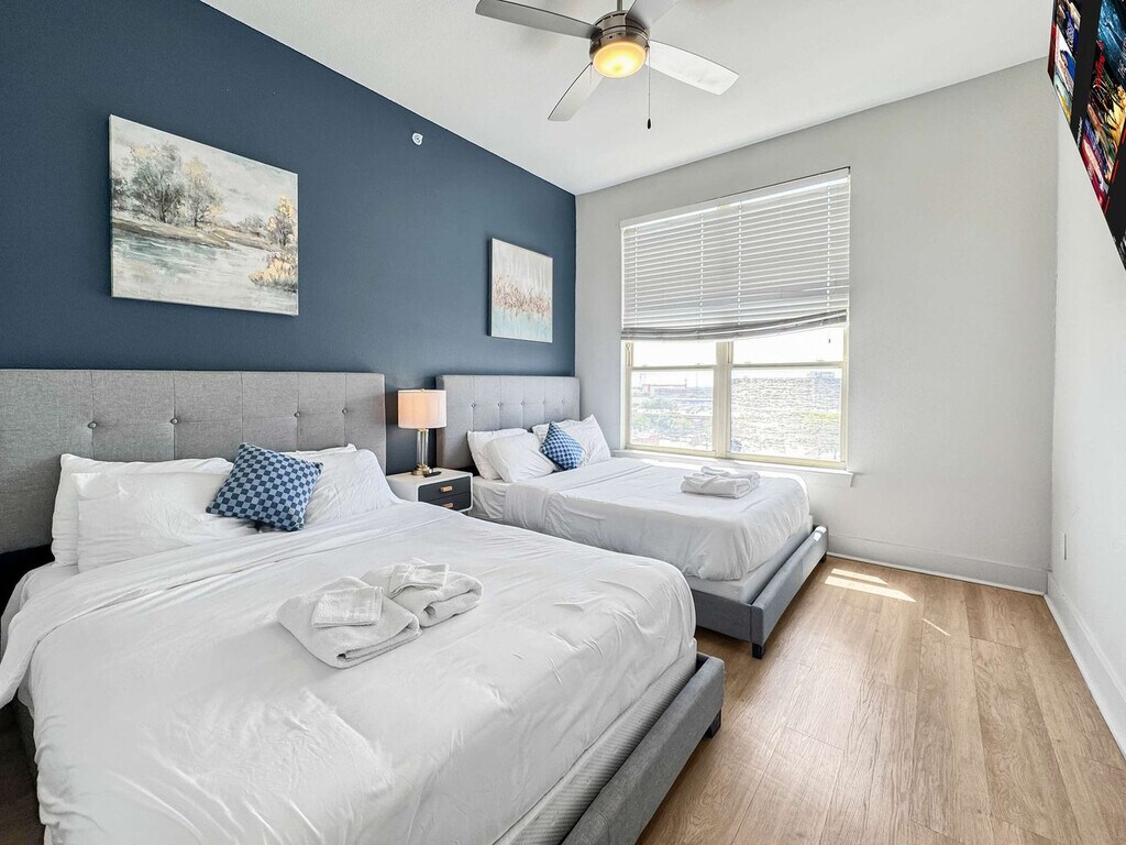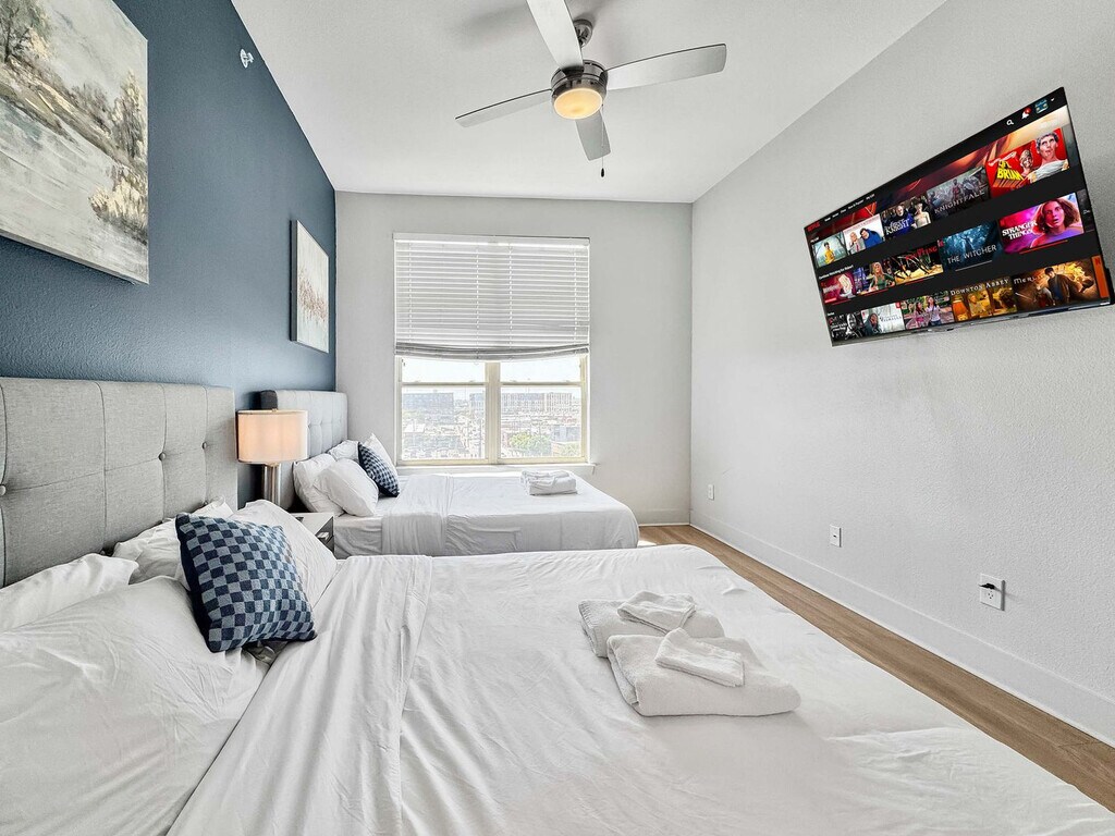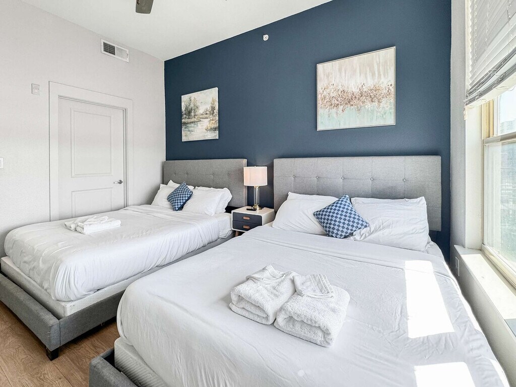 Located in the vibrant heart of Deep Ellum, this Dallas retreat offers the perfect blend of comfort and convenience. Modern, spotless, and complete with high-speed Wi-Fi, the space is designed for both relaxation and productivity. Rest easy in a plush queen bed and take in breathtaking views of Downtown Dallas. With top restaurants, lively nightlife, cultural museums, and green parks nearby, the location is unmatched. Skip the usual hotel rooms and standard rentals and make your stay truly memorable here today. Step into this elegant and contemporary 2-bedroom, 2-bath apartment, crafted with style and comfort in mind for an effortless stay. The open-layout living and dining area showcases modern LED lighting and chic furnishings, offering both sophistication and a welcoming vibe. Expansive windows fill the bedrooms with natural light and city views, while polished wooden floors add warmth and charm. Unwind in a cozy lounge area featuring a plush sofa with a coffee table and a 55” HDR Smart TV with Netflix. Your private retreat includes a queen-size bed with a luxury foam mattress, a 45” HDR Smart TV with Netflix, a walk-in closet, bedside lamps, a desk, and a chair. The second bedroom is perfect for restful nights, offering two queen-size beds with soft foam mattresses, a walk-in closet, and reading lamps. A fully equipped kitchen is ready for any meal, featuring a stove, oven, fridge/freezer, dishwasher, Keurig coffee maker with supplies, water kettle, sink with hot and cold water, cookware, glassware, and utensils. Your health and peace of mind are important, with enhanced cleaning practices followed after each guest. Pets are welcome based on size, with a pet cleaning fee of $25 per night for 1–4 nights, $200 total for 5–29 nights, and $300 total for 30+ nights. Please notify in advance to avoid cancellation. Guest verification is required before check-in, which may include providing a valid government-issued photo ID, confirmation of contact details, secure portal verification, and in some cases, a background check. Information is used only for screening and never stored beyond verification. Guests must sign a rental agreement upon reservation approval, agreeing to rental terms and conditions, submitting a valid ID before check-in, and completing the verification process to receive check-in details. Verification must be completed within 24 hours of booking, or 1 hour for same-day reservations, to avoid cancellation. For your safety, the property includes hallway security cameras and a Minut device monitoring indoor noise levels. [SI]
