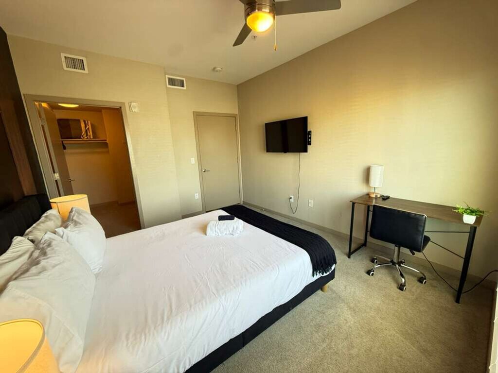 The advertised rate of $2,361/month is the lowest available price, based on a 30 day(s) stay with a move-in date of July 19, 2026. Rates vary depending on the duration of stay, season, and other parameters. For exact pricing and additional pricing components, please visit our website and enter your desired move-in and move-out dates. The rate is applicable when billed upfront; it can be higher if billed in multiple payments. Feel at home in this beautifully designed 2-bedroom apartment in the heart of Downtown Phoenix. This stylish retreat is perfect for business travelers, couples, or weekend getaways. The open-concept layout seamlessly blends the living room, dining area, and kitchen, creating a bright, spacious setting. The fully equipped kitchen includes a stove, oven, microwave, refrigerator/freezer, dishwasher, toaster, coffee maker with coffee essentials, electric kettle, sink with hot and cold water, cookware, glassware, silverware, and utensils. Entertainment options include three 43" 4K HDR smart TVs and one 55" 4K HDR smart TV. One designated parking space is included. Instructions for printing the parking pass will be provided prior to check-in. Pets are allowed depending on size or if they are service animals, and an additional cleaning fee of $20 per night is required per pet. There is a 2 pet maximum and only cats/dogs are allowed. As the building management requires additional information about each pet included in the reservation, guests are requested to send the following pet details: Name, Breed, Color, Photo, Rabbit shots, and (if a service animal) Certification for the nature of service. Located in a prime central location, this apartment is steps from the city’s best art, dining, and entertainment. Immerse yourself in the Roosevelt Row Arts District, known for its eclectic galleries and striking street art. Enjoy a wide variety of dining options, from trendy cafés to upscale restaurants. Chase Field and Footprint Center are only minutes from the property. Unwind at nearby Hance Park, a peaceful city retreat featuring walking paths and open green spaces. With easy access to light rail stations and major highways, getting around Phoenix and exploring the surrounding areas is simple and stress-free. Guest verification is required, and all guests must be 23 years old and above. If you are found to have brought pets without prior notification, there will be a $500 fee. There are noise monitors installed in the unit that measure the noise levels in decibels. If tampered with, there will be a fee. There are security cameras in the hallways for security. Includes a dedicated workspace with a desk and chair in bedroom 1. [SI]