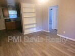This second-floor unit features a spacious family room complete with built-in shelving. The kitchen comes equipped with a refrigerator, stove, and a countertop microwave (as-is). It has been recently refreshed with new paint, ceiling fans, mini blinds, a linen closet, and wood plank-style laminate flooring.