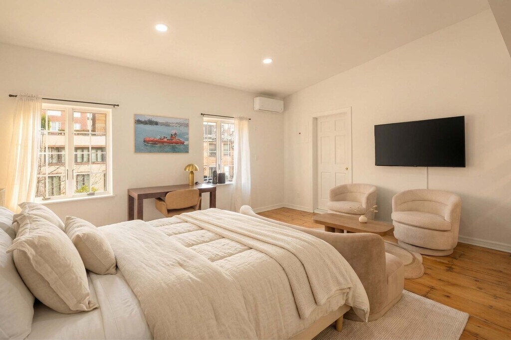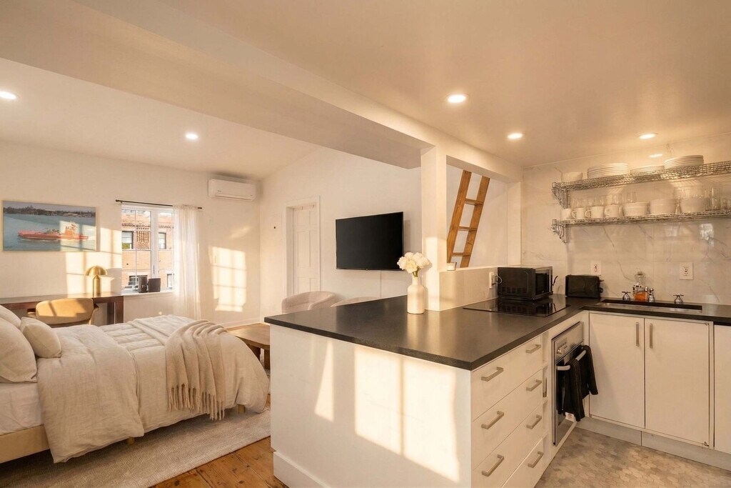 The advertised rate of $5,923/month is the lowest available price, based on a 30 day(s) stay with a move-in date of January 3, 2027. Rates vary depending on the duration of stay, season, and other parameters. For exact pricing and additional pricing components, please visit our website and enter your desired move-in and move-out dates. The rate is applicable when billed upfront; it can be higher if billed in multiple payments. Feel at home in this one-of-a-kind studio with sleeping loft on the top floor of a historic Greenwich Village townhouse, offering a serene, light-filled retreat. This studio offers privacy, tranquility, and character. The spacious living area features 10-foot ceilings, antique wide-plank hardwood floors, and north-facing windows overlooking trees and gardens, ensuring a quiet, sun-dappled environment. The renovated kitchen is outfitted with European appliances, including an induction cooktop and dishwasher, complemented by smart cabinetry and prep space. The windowed bathroom is sleek and modern, featuring a glass-enclosed rain shower and oversized mirrored vanity. The sleeping loft, with 4–5-foot ceilings and a skylight, can accommodate a king-size bed or serve as a generous storage area, adding versatile functionality. Additional comforts include a split-system A/C unit providing year-round heating and cooling. Concierge service can coordinate cleanings and private events. Private chefs and excursions can be scheduled. Located just off 5th Avenue on 9th Street, the townhouse is moments from Washington Square Park, NYU, and Astor Place, with convenient access to the 8 St–NYU (R/W), Astor Place (6), and West 4 St (A/C/E/B/D/F/M) subway stations. Excessive use of A/C (exceeding $250/month) will be billed back after move-out. Smoking is not allowed on the property. [SI]