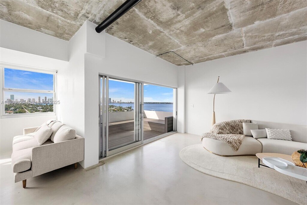 Breathtaking views from this one-of-a-kind, corner loft-style, fully furnished penthouse in an iconic Art Deco building designed by renowned architect Morris Lapidus. Ideally located near the Venetian and Sunset Islands, this sky residence features modern finishes with a clean architectural feel, including an open kitchen, exposed concrete ceilings, wood and stone accents, designer lighting, and custom cabinetry. Floor-to-ceiling windows open to a corner balcony with stunning bay views and direct sunsets. Penthouse D offers 2 bedrooms and 2 full baths, with the second bedroom open to the living area and including a sofa bed, perfect as a den or guest space. One-year rentals only. Truly one of a kind and easy to show. MLS # A11930805