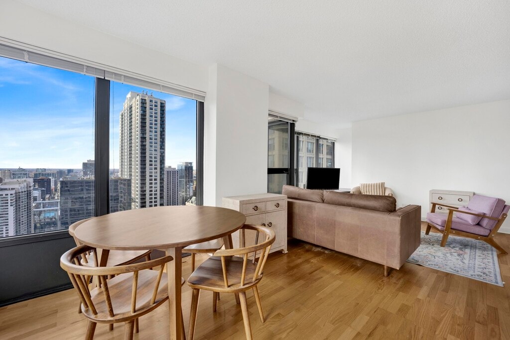 - Fully Furnished Rare Corner 1-Bedroom Unit a whopping 1200 square feet (bigger than 2-bedrooms in Gold Coast). The unit is TURN-KEY READY; Steps from Michigan Avenue; linens, cookware, cutlery, towels, bedding, TV included~~Please indicate your move-in date, lease term, if you have any pets and about yourself (what brings you to Chicago) in the inquiry form. The inquiries are responded to in the order of move-in date (first come, first serve) so please indicate the earliest move-in date you can do in the request form to book the unit you are interested in. Please specify if you are looking for a furnished or unfurnished unit. You will be receiving a text message to set-up a virtual or in-person tour so please indicate a phone number where you can receive text messages. You will NOT be receiving a call. If you do not fill out details about your move-in and only submit a blank request, your request will not receive a response. Minimum credit score required is 700 with 1:3 rent:income ratio. If you are international, please indicate it in your request form so we can reach out separately.