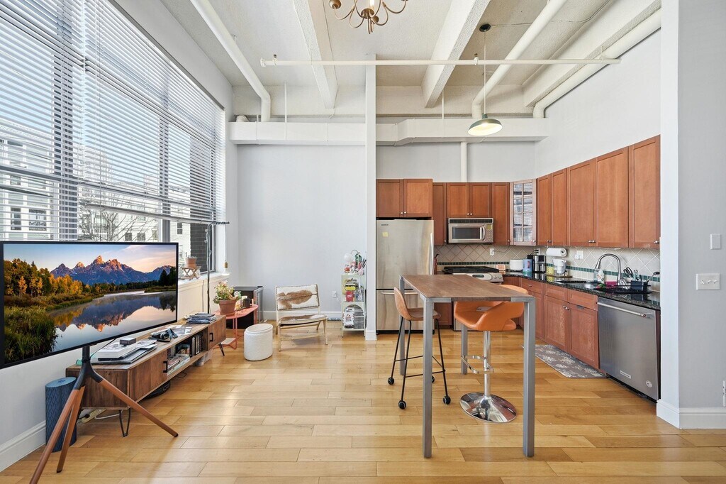 FOUNDRY LOFTS at Liberty State Park Jersey City: Oversized 1-bedroom loft apartment with 845 sq.ft. and 1-car parking included. Featuring 13' tall ceilings throughout, tons of closet space, wall of windows (9' tall). Central heating & A/C. full-sized washer & dryer in apartment. Stainless steel KitchenAid appliances include 36" bottom freezer fridge, dishwasher, microwave. Monthly rent includes 1 car parking space, as well as gym access. Minimum 1-year lease term. Gas & electric are not included, landlord provides cold water. Xfinity & Verizon Fios available.