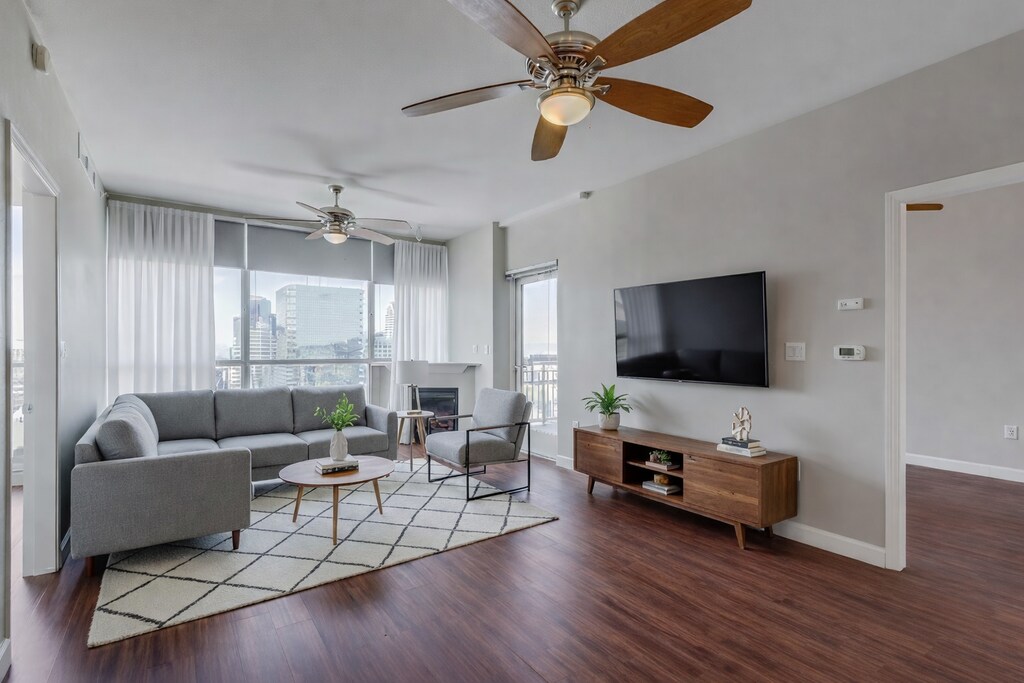 Welcome to urban living at its finest in this stunning high-rise condo located at 300 West Beech Street, San Diego. This UNFURNISHED unit offers breathtaking panoramic views of the city skyline, visible through expansive floor-to-ceiling windows that fill the space with natural light. The open-concept living area features elegant hardwood flooring and a cozy fireplace, perfect for relaxation or entertaining guests. The modern kitchen is equipped with stainless steel appliances, sleek countertops, and ample cabinetry, making it a chef's delight. The primary suite is a serene retreat, complete with a spacious layout and an en-suite bathroom featuring contemporary fixtures and finishes. Additional highlights of this residence include a private balcony with sweeping city views, in-unit laundry for convenience, and access to building amenities such as a fitness center and pool. Situated in a prime location, residents enjoy easy access to San Diego's vibrant downtown scene, including dining, shopping, and entertainment options. Experience the epitome of luxury and convenience in this exceptional property.