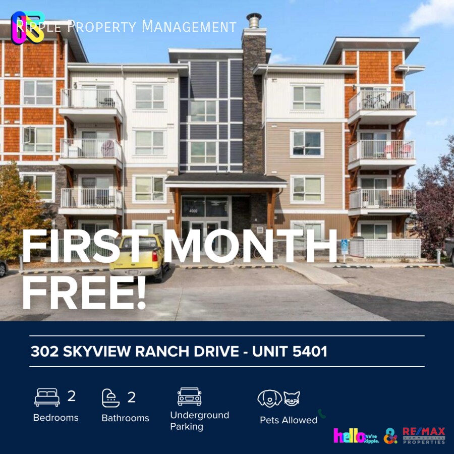Modern 2 Beds, 2 Baths Apartment/Condo | 2 Pets Allowed. 20lbs Max | 50% Off First Month if move-in by Dec 1/25 Welcome to your new home at 302 Skyview Ranch Drive - Unit 5401 - Unit 5401 — a modern and well-maintained 2 beds / 2 baths / Apartment/Condo offering comfort, space, and convenience. Ideally located close to shopping, schools, parks, and transit. _____________________________________________________________ SHOWINGS: Conducted in an open-house format — book your appointment today! Prices, availability, and promotions are subject to change without notice. VIDEO TOUR: _____________________________________________________________ PROPERTY DETAILS: - Furnished or Unfurnished: Unfurnished - Pets: 2 Pets Allowed. 20lbs Max - Smoking: Non- Smoking - Parking: Underground - Storage Included: Yes - Laundry: In- Suite Laundry - Management Type: Full Management - Lease Term: Long Term _____________________________________________________________ UNIT FEATURES: - The unit is on the top floor corner - The living room is open with 2 sides for full day sunlight, connected with Balcony and other rooms - Open concept kitchen with plenty of soft closing cabinets - Kitchen features granite countertops and stainless steal appliances - The main bedroom comes with a 2 sided closet. Window for ample sunlight and carpeted flooring - One private bedroom with closet - Balcony with BBQ included - In- suite laundry - Window coverings included ____________________________________________________________ UTILITIES: - Utilities Included: Heat,Water Here's a helpful tool you can use to get a rough estimate of utility costs. Just check out the link: _____________________________________________________________ LOCATION HIGHLIGHTS: - Outdoor Living: Nearby Parks, Pathways, Greenspaces - Transit & Access: Transit Lines / Major Roads Nearby - Family Friendly: Close to Schools, Childcare, Rec Centres - Local Conveniences: Groceries, Shops, Restaurants, Services Nearby Don't wait — properties like this don't last long. Book online today: