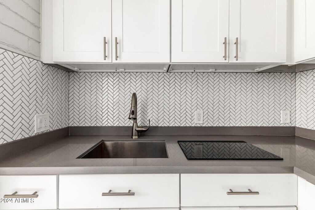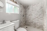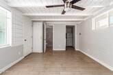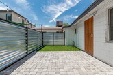 Low-maintenance efficiency unit with a spacious fenced backyard,pavers,and artificial grass. Interior features gray plank tile throughout,an open living space,and a tiled walk-in shower. Kitchen includes quartz countertop,tile backsplash,white cabinets with handles,electric cooktop,and refrigerator. Available for touring.