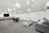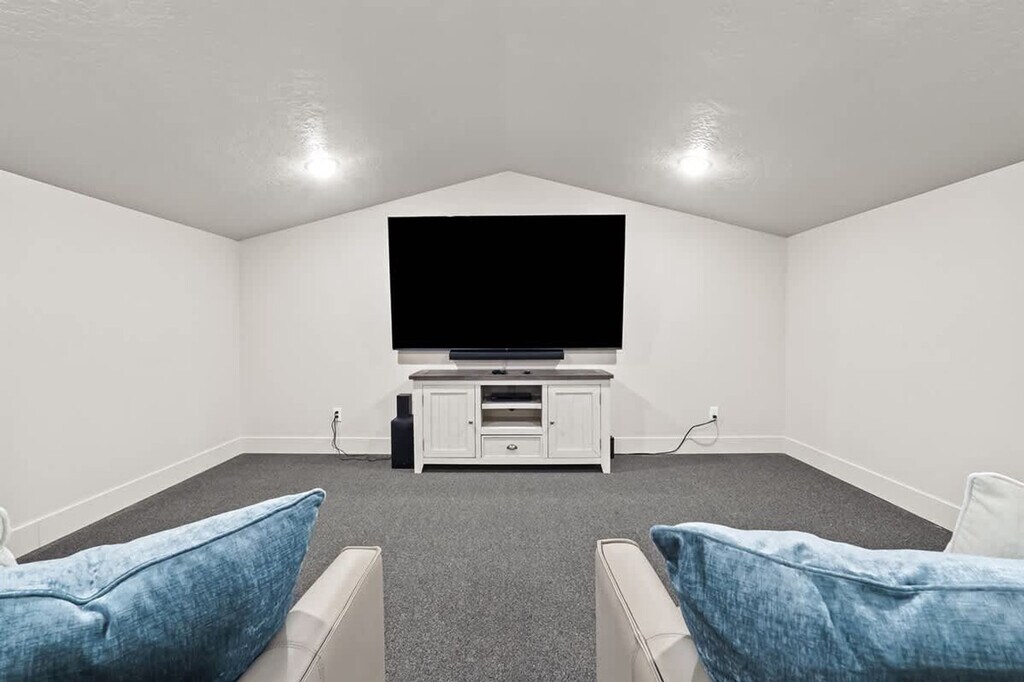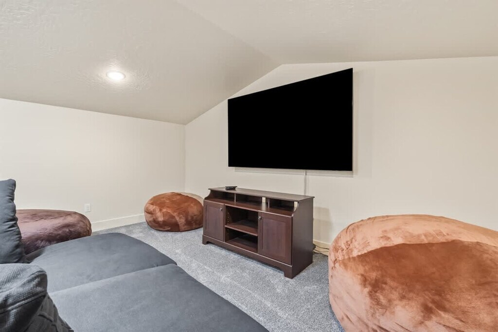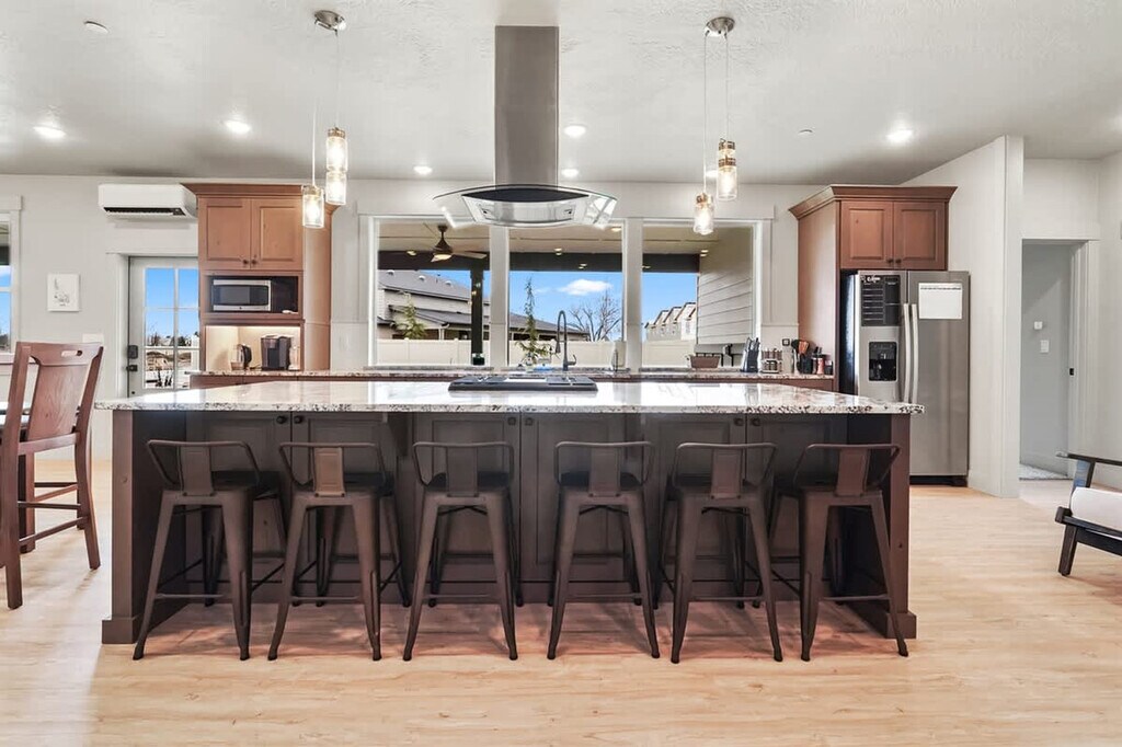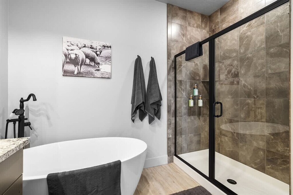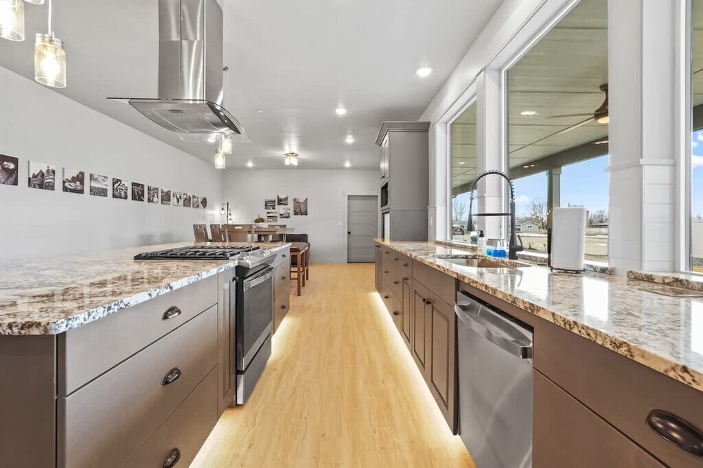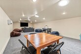 Escape to the Barndominium Getaway and feel at home in this charming farmhouse-inspired setting. This spacious retreat offers room for everyone to relax, play, and enjoy each other’s company, comfortably sleeping 18 guests inside and up to 10 more in the bonus room. This stunning property features 2 king-size bedrooms, one with an en-suite featuring a tiled shower and freestanding tub. The spacious bonus room is a massive entertainment space for all ages, featuring games and additional sleeping options with rollaway floor mattresses, accessed through the garage for privacy and convenience. Enjoy farmhouse vibes throughout with charming decor, giant patios surrounding the home ideal for BBQs and lounging, and a fully equipped kitchen with a gas stove, fridge, and ample counter space. A washer and dryer are available for your convenience during longer stays. RV hookups are available for extended family or friends traveling in an RV for an additional charge. Smoking inside the home will result in a $250 cleaning fee. Parties, events, and unauthorized gatherings are strictly prohibited and violation may result in immediate termination of the reservation without a refund and an additional cleaning or disturbance fee. Late check-outs beyond 30 minutes without prior approval will incur a $300 fee. Additional unregistered guests may incur a $100 per person per night fee. Well-behaved pets are allowed with prior approval and a fee of $50 per pet per stay. Quiet hours are from 10:00 PM to 8:00 AM. Tampering with security devices is strictly prohibited and will result in cancellation without refund. [SI]