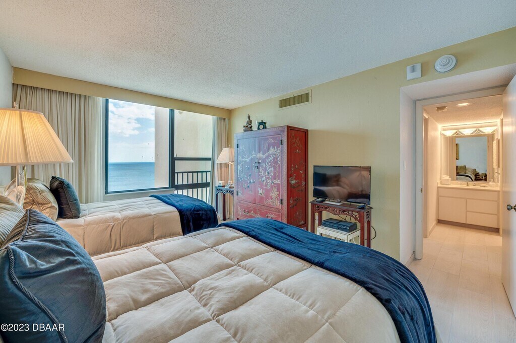 Beachfront Condo with beautiful scenic views. This 2/2 10th floor fully furnished condo is perfect for beach lovers & features large balcony with views of the ocean & bay. Community social area, fitness center, gorgeous pool and large deck that looks out to ocean, shuffleboard court and outdoor grill. Great 2/2 10th Floor Condo on World Famous Daytona Beach. Live the beach lifestyle in the furnished beachfront condo with a balcony with beautiful scenic views of the ocean, bay & city, new flooring, split bedroom plan & beach access. This is in a gated community that has open social room, fitness center, gorgeous pool and large deck that looks out to ocean, shuffleboard court and outdoor grill.