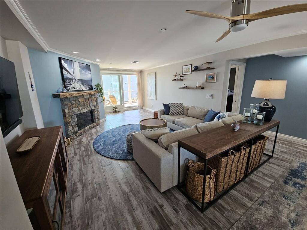 WATERFRONT CONDOMINIUM LOCATED ON THE HARBOR OFF THAMES STREET JUNE & JULY RENTAL FOR 2026-This 2-bedroom 2 bath unit has been completely renovated with light colors and all the amenities one needs to enjoy your summer vacation. The open floor plan is great for family gathering & entertaining. The space consists of an ample eat in kitchen with a dining nook overlooking the harbor and wharf area plus a large living room with a fireplace and an office area. The fully equipped kitchen has quartz counters,all new stainless appliances plus custom cabinets & drawers. The living room flows to the sliders which lead to an oversize outside deck. The unit is on the 3rd floor with great water views of the harbor and the downtown area. The primary bedroom has a custom walk-in closet,a beautifully renovated bathroom,water views & a slider to the outside deck. The 2nd bedroom has a completely renovated bathroom and hidden laundry closet. The floors are porcelain tiling throughout. Central air and custom ceiling fans if ocean breezes are preferred. This unit is perfect in every way. Lobby w/elevator. Outdoor pathways lead to the garden area and waterfront. Private compound w/covered parking space. Walk to everything! Utilities included w/a cap of $250 per month. RENTAL MONTHS & PRICING AVAILABLE for 2026 ARE– JUNE $12,000 and JULY $15,000 - OCCUPANCY NO MORE THAN 4 PEOPLE. MLS ID 1402781