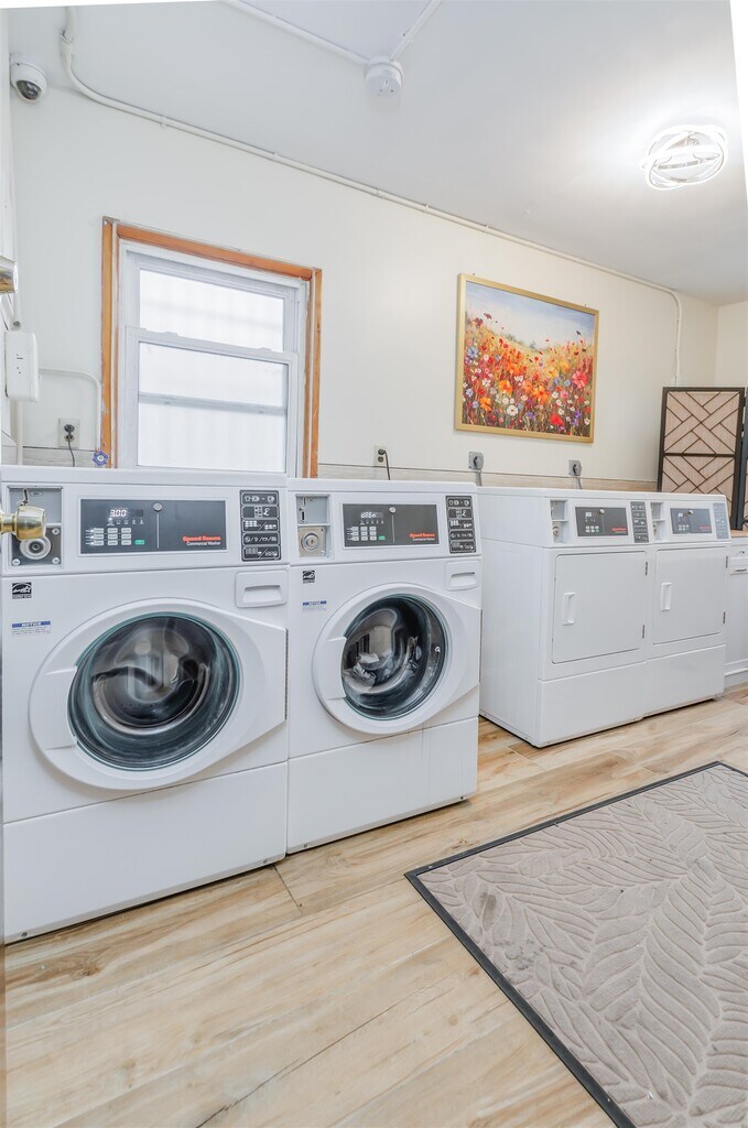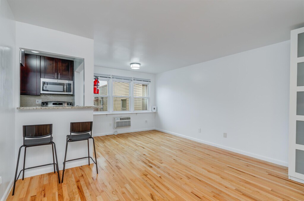 Bright and well-maintained 600 sq ft one-bedroom, one-bathroom condo for rent in Guttenberg, NJ featuring an open-concept living and dining area, an eat-in kitchen with a bar-stool-height counter, beautiful hardwood floors, wall-unit A/C, smart lock and smart home features for added efficiency and comfort. The building is equipped with security cameras and offers a laundry room with washer and dryer on the ground level. Conveniently located near Bergenline Avenue for shopping, dining, and everyday essentials, and close to James J. Braddock North Hudson County Park for outdoor recreation. Easy commute to Manhattan with nearby NJ Transit buses providing direct service to Port Authority Bus Terminal in approximately 20?30 minutes, plus access to the Port Imperial ferry for an alternative commute option.