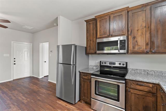 Welcome to this well-appointed 1-bedroom, 1-bathroom unit located in the heart of Denton. The home features luxury vinyl plank flooring throughout and an open-concept kitchen with custom knotty alder wood cabinetry, stone countertops, and stainless steel appliances—including refrigerator, stove/oven, microwave, and dishwasher. The space offers excellent natural light, a neutral color palette, ceiling fans in both the living room and bedroom, and central heating and air for year-round comfort. A stackable washer and dryer is included for added convenience. Parking is located directly outside the unit, and window blinds are provided for privacy. Conveniently situated just minutes from the University of North Texas, Texas Woman’s University, Denton Square, local shops, and restaurants, with easy access to I-35W, I-35E, Loop 288, and Highway 380. Come make your home with us and visit our website to schedule a tour at or call us with any questions at , Option 2. Applications must be completed online at by clicking Apply Now. Please know that everyone over the age of 18 must complete an application. Note: Non-refundable $75 Application Fee, Rental Insurance is Required, No Pets, Water Billed Back to Tenant based on Total Square Foot, Tenant secures Trash & Electric, $50 Service Fee.