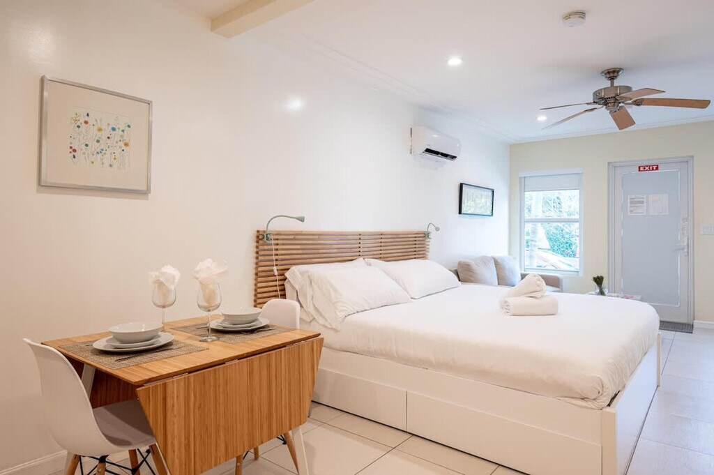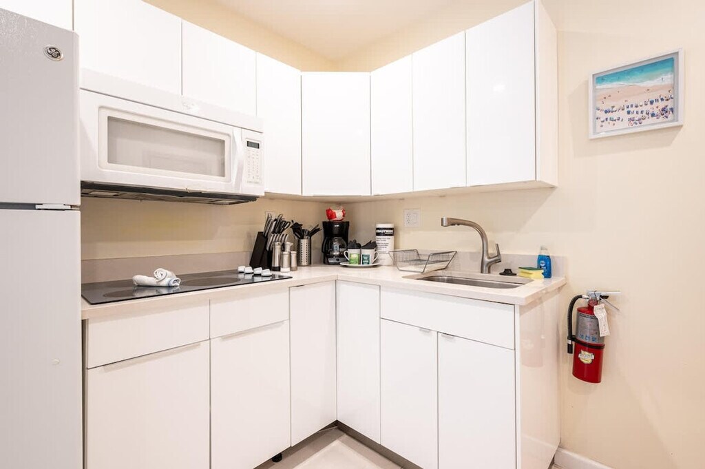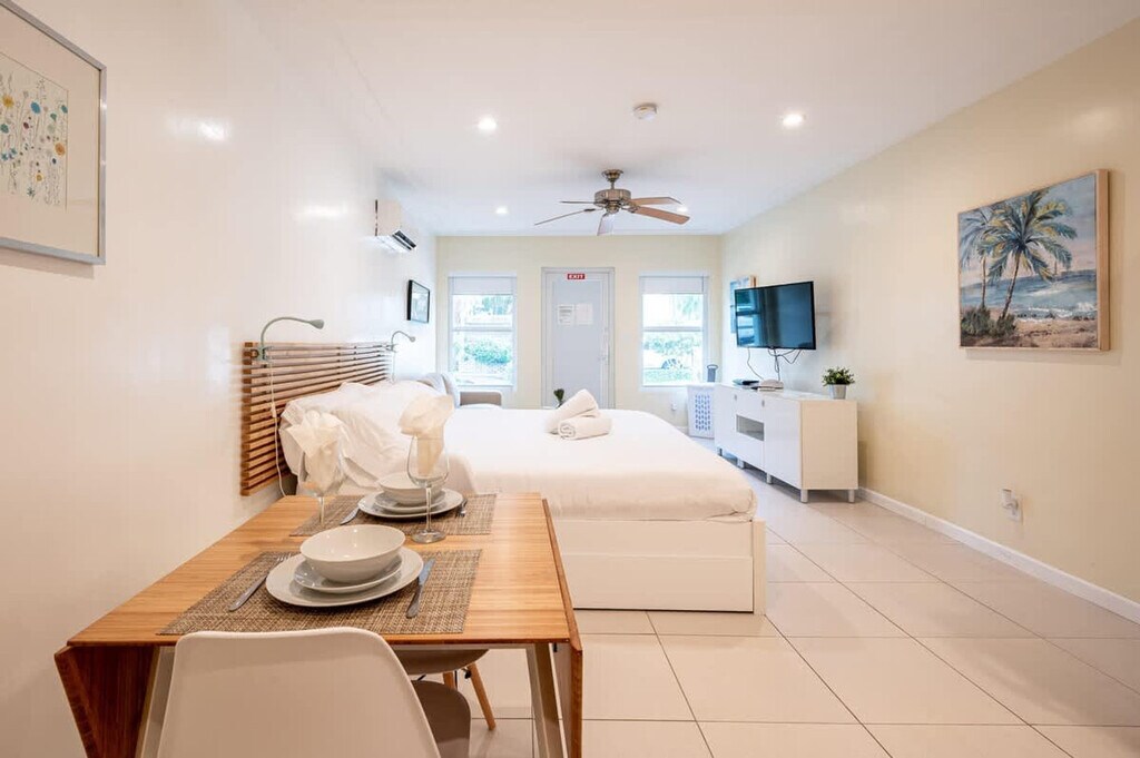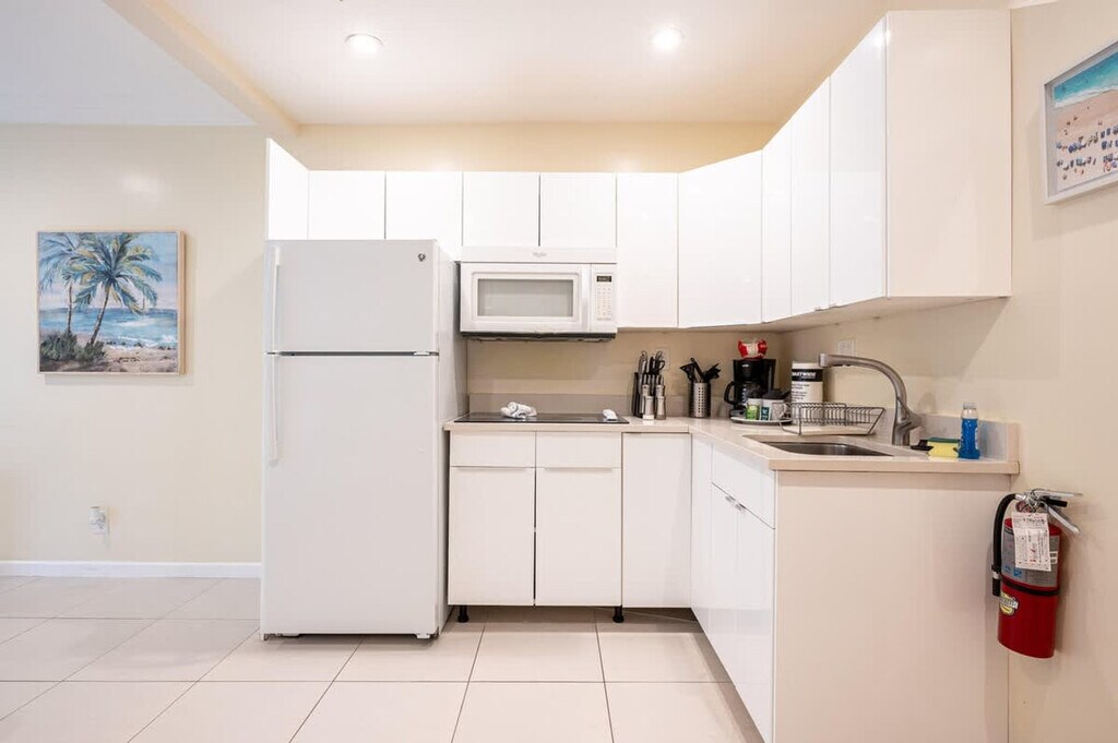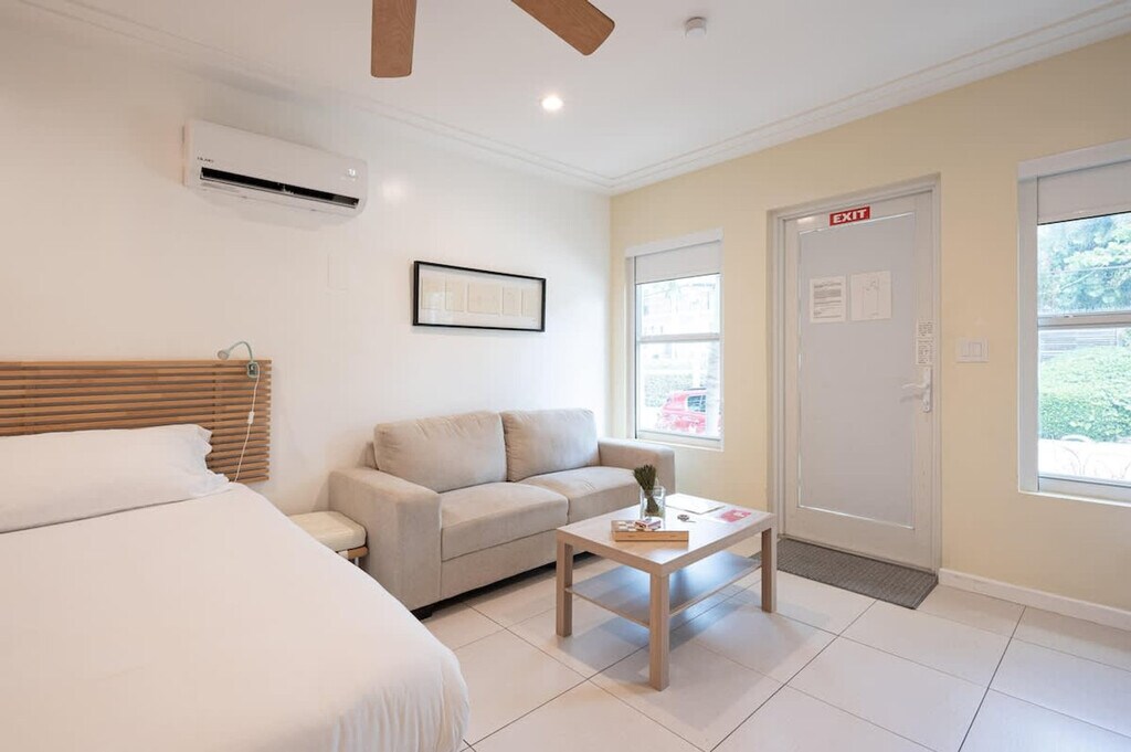 Casa del Mar is a charming studio located in Hollywood, FL, just steps away from the beach. Feel at home with your own private entrance and easily check yourself in using the lockbox. The studio features a king-size bed, providing a cozy retreat after a day of sun and sand. The studio is equipped with free Wi-Fi and a fully equipped kitchen, including a microwave, refrigerator, coffee-maker, stove-top, and toaster. Enjoy the convenience of a washer and dryer available for free 24/7, and stay comfortable with A/C and its own thermostat. Beach chairs, umbrellas, and towels are included for your enjoyment. Street parking is available at $21.90 per day, with a QR code required at check-in for access. Nestled on a quiet street, Casa del Mar offers easy access to a traffic-free oceanfront promenade that stretches 2.5 miles north. Enjoy a leisurely stroll with ocean views, or explore the vibrant downtown Hollywood just 2 miles away, featuring restaurants, bars, musical venues, art exhibitions, and a historic theater. The Ft. Lauderdale-Hollywood International Airport is conveniently located just 14 minutes away by car. The beach is within walking distance, and grocery stores, restaurants, coffee shops, bakeries, and bars are a short drive away. A bus to downtown Hollywood is a 10-minute walk from the apartment, and within downtown, a free electric shuttle is available, though it does not extend to the apartment. A laptop computer is not included.