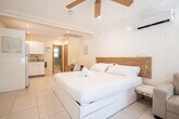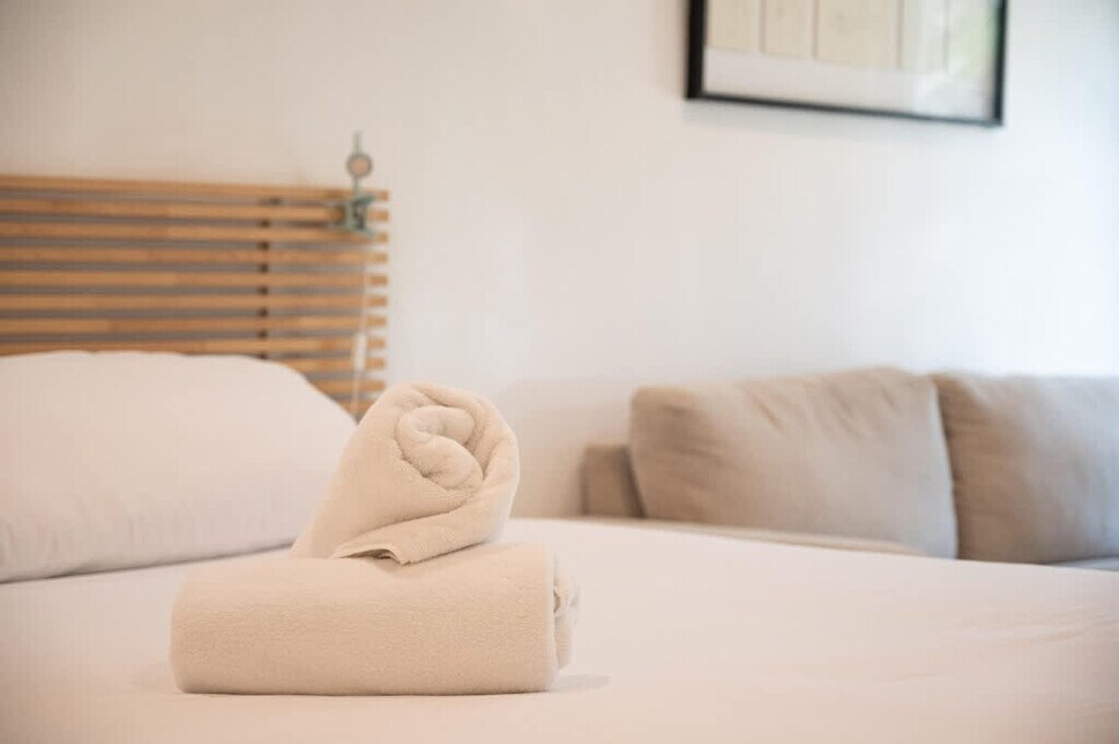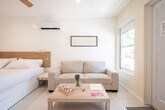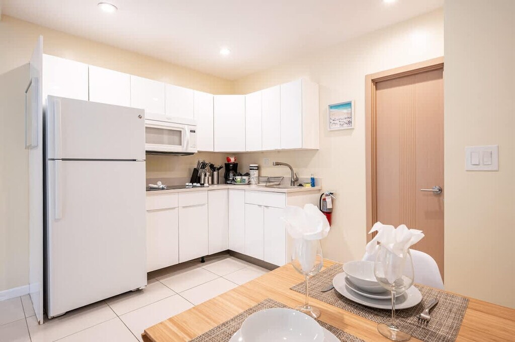 Feel at home in this new 2-bedroom, 2-bathroom apartment featuring contemporary interiors that are welcoming and bright with natural light. The apartment includes a fully equipped kitchen, a master bedroom with a full bath and shower, a second master bedroom with bunk beds, a sofa bed in the living room, and an extra fold-up bed. Enjoy entertainment on the two HD TVs and stay comfortable with the very quiet AC. The apartment also offers private parking and a BBQ area, and is situated in a beautiful courtyard with tables, chairs, and lounges. Located in the heart of Hollywood Beach, the apartment is on a quiet residential street just steps away from the beach and Boardwalk. This apartment comes with private parking on the property and a private patio with a BBQ grill and outdoor table and chairs. Beach chairs, umbrellas, and towels are also provided for your convenience. For street parking, a QR code will need to be scanned at check-in, with a fee of $21.90 per day. Nestled on a quiet street, this apartment is close to a variety of restaurants and bars. Public transportation is readily available, making it easy to explore the surrounding area.