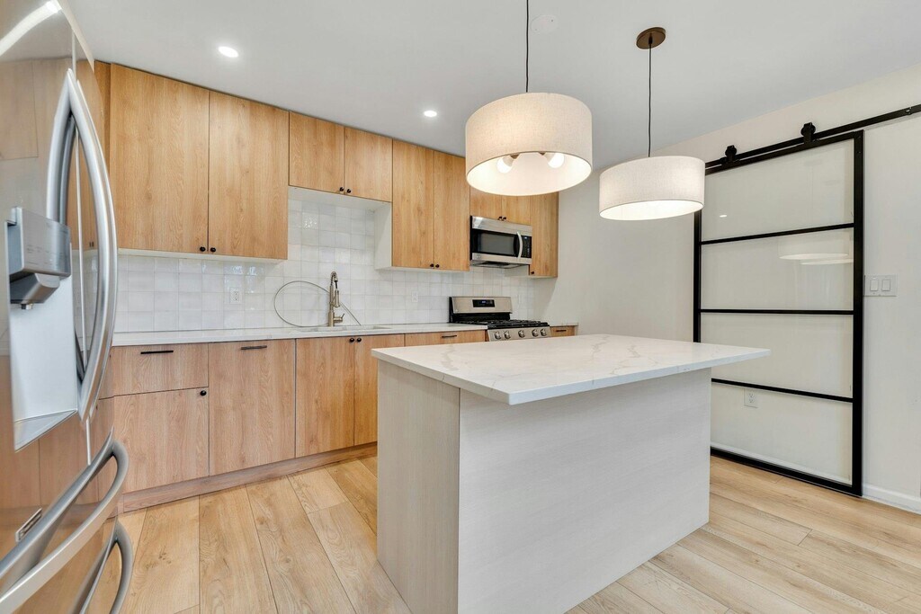 Fully renovated 2BR/1.1BA + Flex space apartment in the heart of Bogota. The gut-renovated kitchen features a quartz island, warm wood cabinetry, stainless appliances, and artisan tile backsplash. A striking steel-framed glass barn door separates the entrance/mud room and kitchen spaces. Two fully updated baths including a spa-grade walk-in shower with large-format porcelain tile, frameless glass enclosure, bench seat, dual showerheads, and marble vanity. In-unit Samsung stacked W/D. Original hardwood floors throughout. Water and gas included in rent. Private entrance, and separate access from commercial spaces. Walkable to Bogota's shops and dining, minutes to Rt. 4, GWB & NYC. Pets considered on a case-by-case basis. This is the renovated Bergen County apartment commuters and professionals are looking for