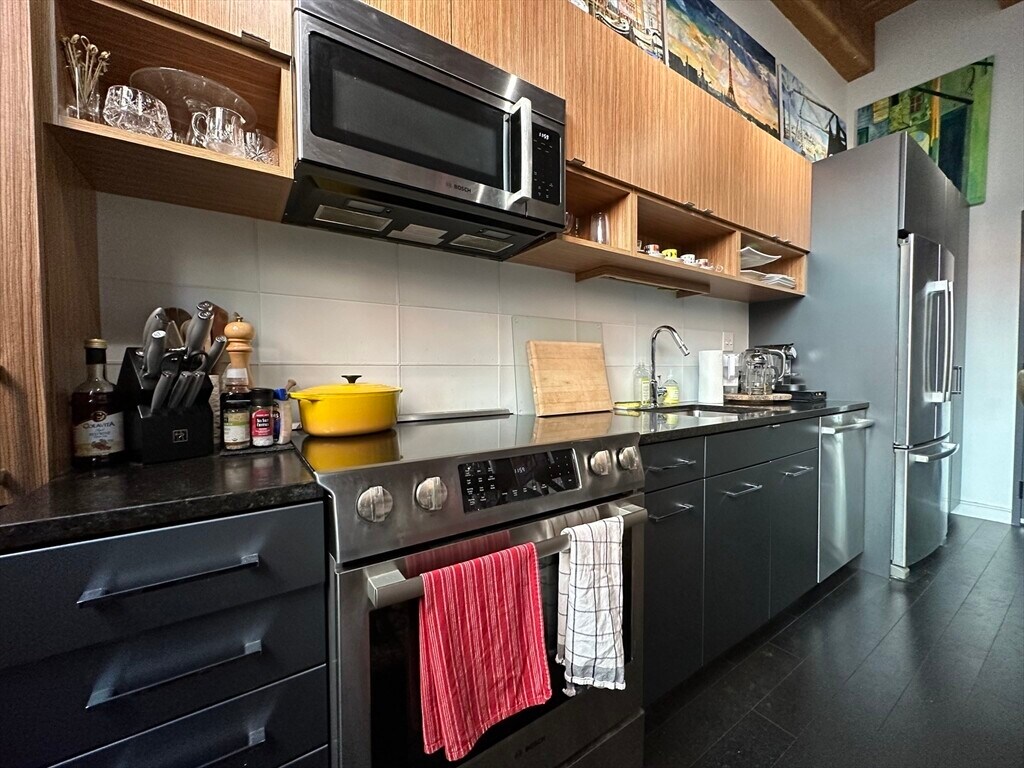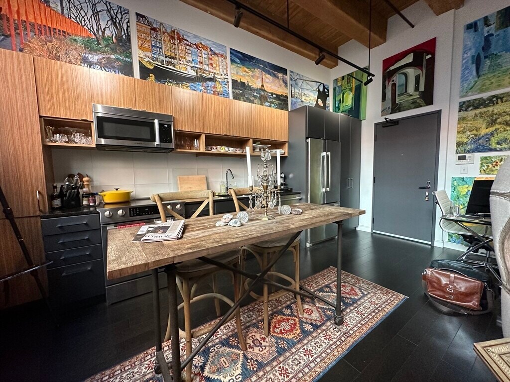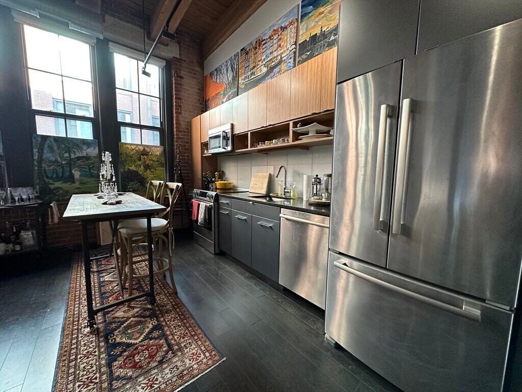 Experience true Boston loft living in this stunning studio at the highly sought-after 319 A Street Lofts. Set within a professionally managed boutique building,this residence blends historic character with modern luxury in the heart of the Seaport. This thoughtfully designed loft features soaring ceilings,oversized windows,and exposed brick and beam construction,filling the space with natural light and authentic industrial charm. The open-concept layout maximizes every square foot,offering flexibility for both living and sleeping areas. The contemporary kitchen is equipped with sleek cabinetry,stone countertops,and stainless steel appliances,seamlessly flowing into the living space—perfect for entertaining or relaxing at home. A modern full bath,in-unit laundry,central air,and custom storage add comfort and convenience. Residents enjoy access to a common roof deck with gas grills and skyline views. Located just steps from Boston’s best restaurants and waterfront. MLS# 73494083