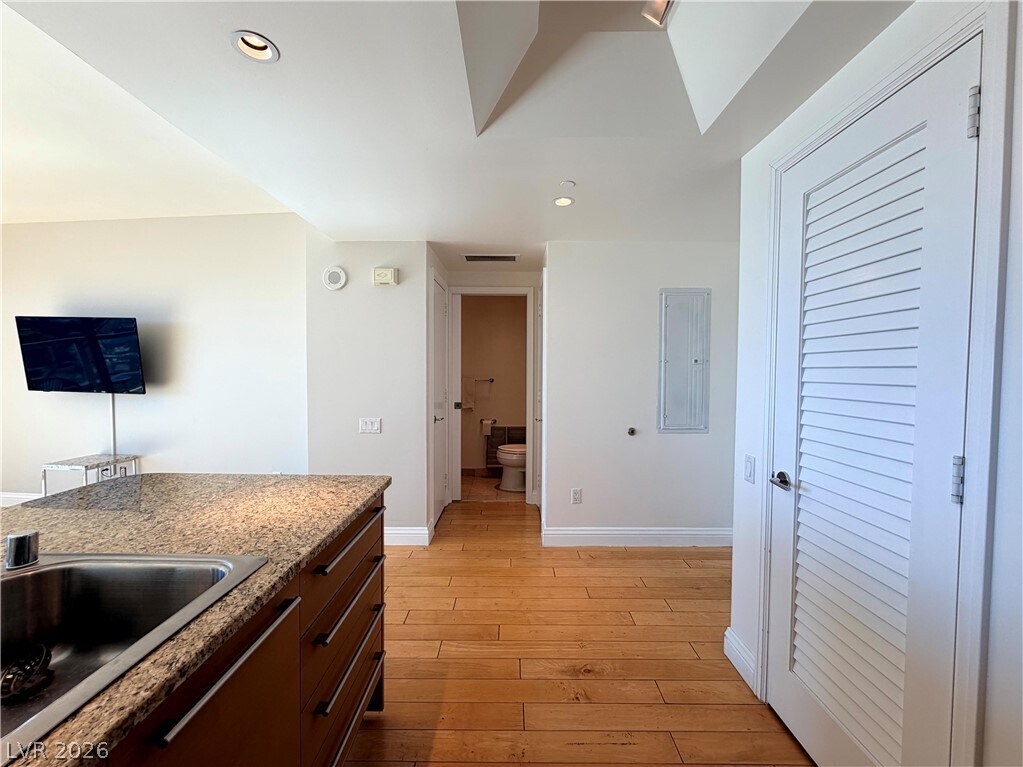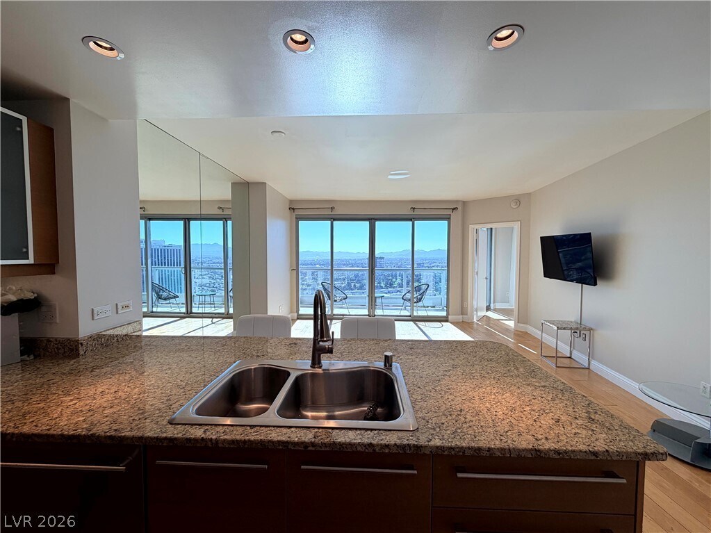 This spacious 1-bedroom, 1.5-bath residence offers an open-concept layout, flooding the interior with natural light and showcasing breathtaking vistas of the Las Vegas skyline and surrounding mountains. Designed with modern elegance, the unit features a gourmet kitchen with granite countertops, high-end stainless steel appliances, and custom cabinetry—perfect for entertaining or casual dining. The primary suite is a serene retreat, complete with a generous walk-in closet and a luxurious bathroom featuring marble finishes, vanity, and a soaking tub. Enjoy indoor-outdoor living with an expansive private terrace, ideal for morning coffee or evening cocktails. Residents of Turnberry Towers enjoy resort-style amenities including a lagoon-style pool with waterfalls, tennis courts, a fitness center, valet, concierge, and 24-hour security. Located just minutes from the Las Vegas Strip, world-class dining, shopping, and entertainment, this is high-rise living at its finest.
