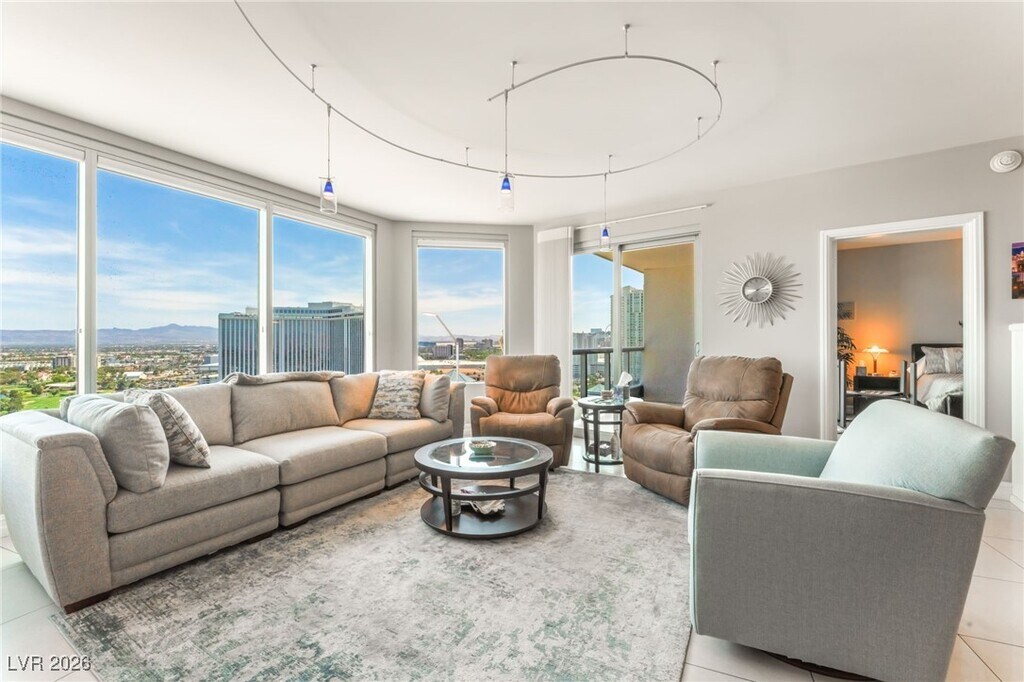 Fully FURNISHED!!! This residence is on a high floor with unmatched 300 degree views of the valley. Impeccably kept throughout the years. Granite countertops, GE mono & profile appliances, Snaiderro cabinets, Bosch W/D, walk-in closet w/built-in closet systems. This is the only floorplan that flows thru the tower allowing you views of the North and South Strip/City/Mtns.