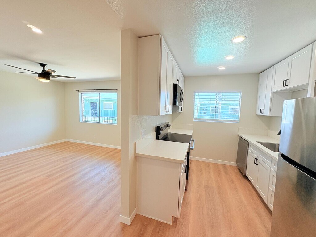 Coastal Oceanside 1BR – West of I-5Updated one-bedroom, one-bath first-floor apartment in prime coastal Oceanside, west of the 5 freeway. Features include:Hardwood floors & fresh paintFully renovated kitchen with stainless steel appliances (dishwasher, microwave, stove, refrigerator and disposal)New cabinets & countertopsModern renovated bathroomLED lighting throughoutIndividual heating in each roomCovered parking includedWalk or bike to the beach, shops, and restaurants. Enjoy the coastal lifestyle in a newly updated unit Welcome to your new home in a well-maintained 30-unit coastal community located west of the 5 freeway. The property offers two floors of apartment living with off-street covered parking, a sparkling pool, and a convenient on-site laundry room.Enjoy the coastal lifestyle—walk or bike to the beach, local restaurants, shops, and all that Oceanside has to offer.