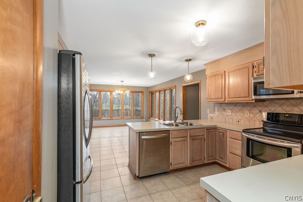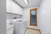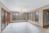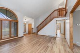 Beautiful Contemporary Home with Golf Course Views and Exceptional Privacy This beautiful contemporary home offers the perfect blend of space,style,and privacy. Set well back from the road and overlooking Radisson Greens Golf Course,it provides over 3,000 square feet of thoughtfully designed living space and a stunning backdrop for both everyday living and entertaining. The main level features a spacious kitchen with a sun-filled morning room,ideally situated between the formal dining room and a cozy family room with a gas fireplace. From the kitchen,step out onto a generous deck that overlooks the private backyard—perfect for relaxing or hosting gatherings. Also on this level is a striking vaulted-ceiling living room,enhanced by a grand Palladian window and a dramatic two-story vertical window that floods the space with natural light and elevates the home’s contemporary aesthetic. A convenient half bath and a generously sized laundry room complete the main floor. A architectural staircase leads to the upper level,where you'll find an expansive primary suite featuring a walk-in closet and an en-suite bathroom with a double-sink vanity. Three additional well-sized bedrooms share a second full bath,also with a double-sink vanity. All bedrooms are finished with plush wall-to-wall carpeting,creating a warm and inviting atmosphere. The finished lower level offers flexible living space—ideal for a game room,home theater,or play area—and includes a bonus room perfect for a home office or a fifth bedroom. Additional highlights include a two-car garage and ample room to meet the needs of modern living. Whether you're entertaining guests or simply enjoying peaceful surroundings,this home delivers comfort,space,and sleek contemporary charm.