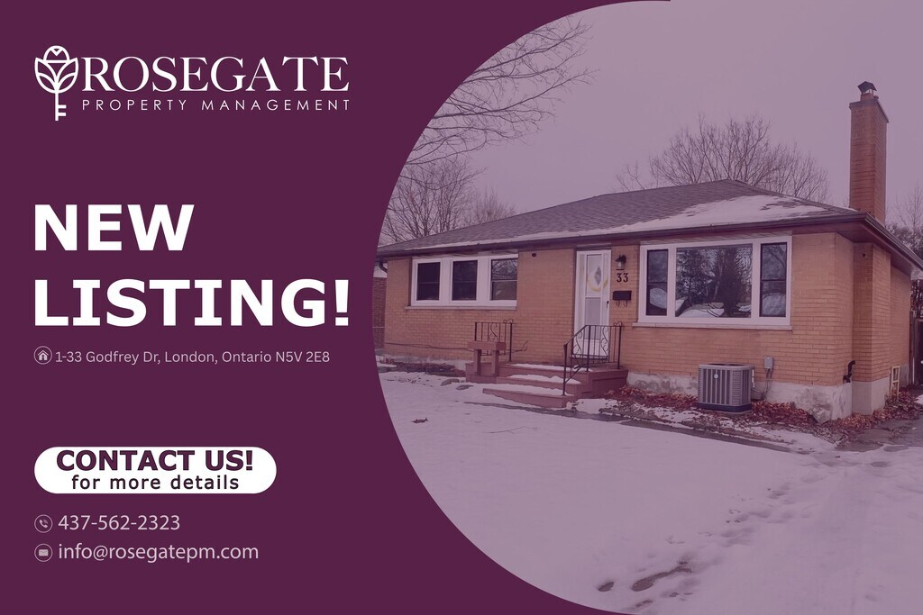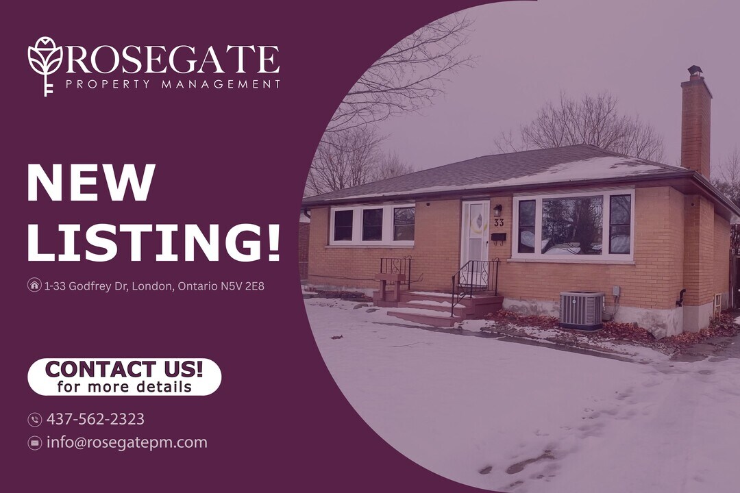 Spacious 3-Bedroom Main-Level Home with Porch, Backyard & Parking in London Welcome to 1-33 Godfrey Dr, London — a bright and well-maintained main-level home offering approximately 1,200 sq. ft. of comfortable living space. With 3 bedrooms and 1 bathroom, this property is ideal for families or professionals looking for space, privacy, and everyday convenience in a quiet residential neighbourhood.The layout features generous living and dining areas, a functional kitchen, and well-sized bedrooms designed for comfortable living. Step outside to enjoy the front porch, perfect for morning coffee, as well as access to a backyard for outdoor relaxation or entertaining.Additional highlights include two dedicated parking spaces, providing excellent convenience. Professionally managed by Rosegate Property Management, this London rental is close to schools, parks, transit, and local amenities—making it an excellent opportunity for quality Ontario rental living.