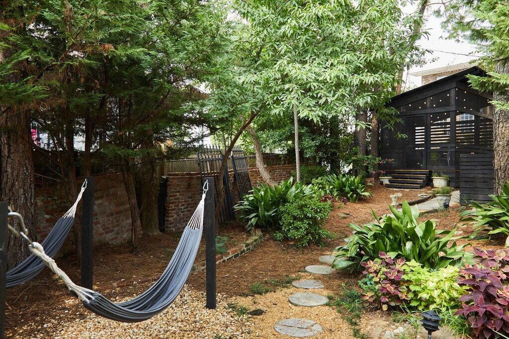 Named by Birmingham Magazine as one of the coolest rentals in town, feel at home in this inviting apartment located on the second floor of a renovated southern gothic mansion. Accessible by a dedicated external staircase, this sunny apartment offers 1000sf of space and is perfect for families or groups of friends. This comfortable apartment features a king-size memory foam bed in the primary bedroom, queen-over-queen custom-built bunkbeds, and a full-size daybed in the second bedroom. The fully equipped kitchen includes high-quality pots, pans, accessories, a dishwasher, a French press coffee maker, a burr grinder, an electric kettle, locally roasted whole bean coffee, assorted teas and cocoa. Enjoy access to fast Wi-Fi and a Roku TV. There is a private washer/dryer in the unit and a shared washer/dryer in the building. The Eden Brae's shared outdoor spaces include an expansive front porch, fire pit, screened-in dining lounge, grill, foosball, cornhole, hammocks, fountains, native gardens, swings, and an outdoor dining room with seating for 10. Dogs are allowed. Eden Brae is located on Cliff Road, between the popular neighborhoods of Forest Park and Highland Park. Highland Park Golf and Tennis Club is just a block away. Rushton Park is a couple of blocks away, and Avondale is a short distance away, offering a park, brewery, restaurants, bars, coffee shops, and stores. Most of Birmingham's popular attractions, such as Railroad Park, the Zoo and Botanical Gardens, Avondale, Sloss Furnace, the Art Museum, Regions Field, and Vulcan Park, are easily accessible by bike or car. Events and gatherings are not allowed in single apartments; to host an event, inquire about renting the whole house. Quiet hours are observed from 9 pm to 9 am. A $500 smoke remediation fee will be assessed if you or any members of your group violate the no smoking or vaping policy. If you bring a pet without notifying us or in violation of this policy, you may be subject to a penalty, in addition to the applicable pet fees. [SI]