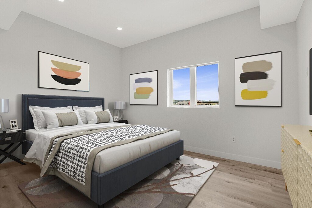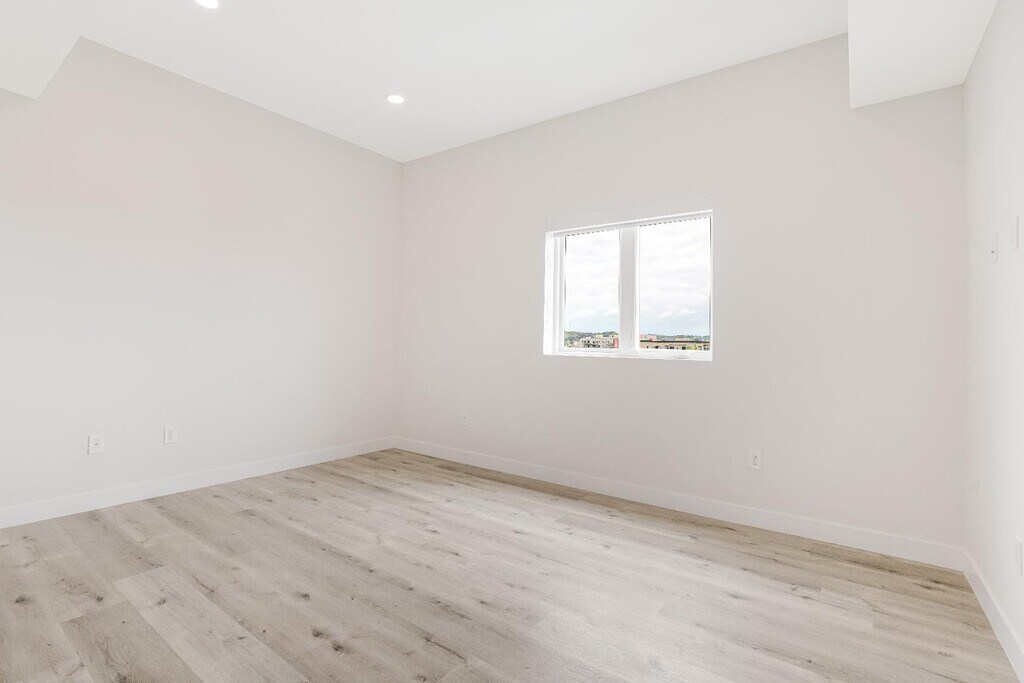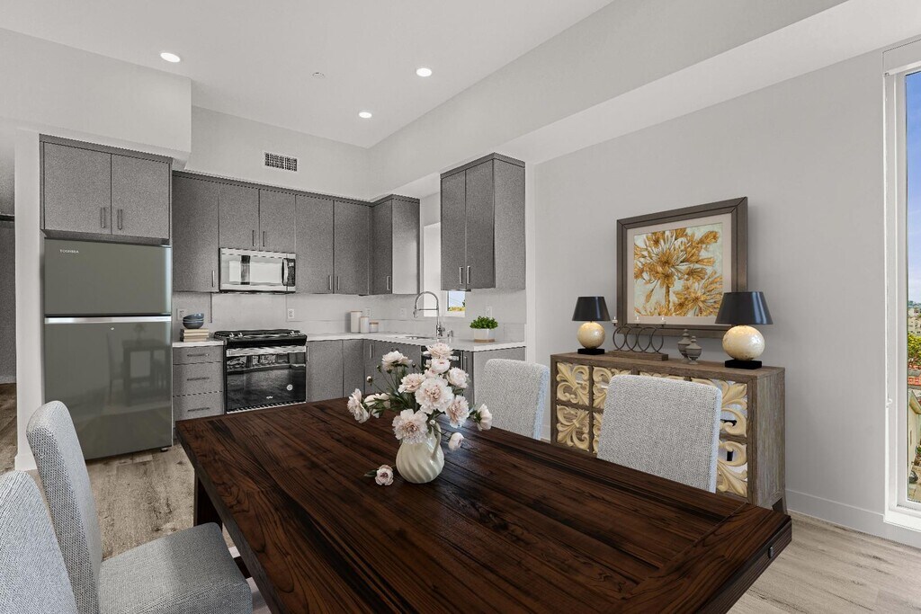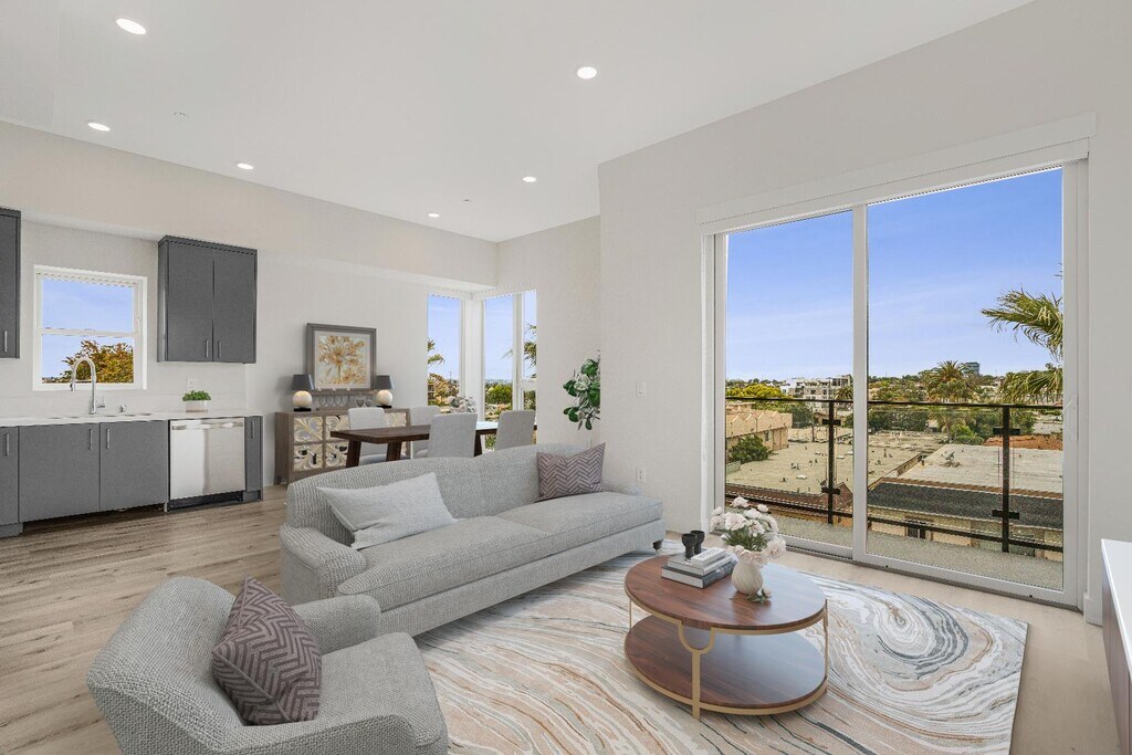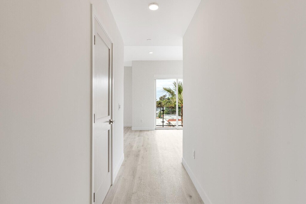 Unit 501 is a beautifully laid out 851 sq ft 1 bed, 2 full bath bright, front facing, luxury penthouse residence located on the top 5th floor. Open plan design extends the living room to a large private balcony on the building façade. Corner windows in dining area provide wide panoramic views. Spacious bedroom features a walk-in closet. There are separate built-in washer/dryer and linen/storage closets. 1 parking space is included. The Jade of Palms is a new boutique complex of 15 thoughtfully designed apartments featuring premium flooring, high ceilings, huge windows for ample natural light, kitchens with quartz countertops, premium stainless steel appliances, walk-in closets, bathrooms with premium fittings and tapware, in-unit washers and dryers, central AC, storage closets, parking in secure gated garage with EV chargers and bike storage, controlled entry, common use rec room, and shared rooftop deck with BBQ.