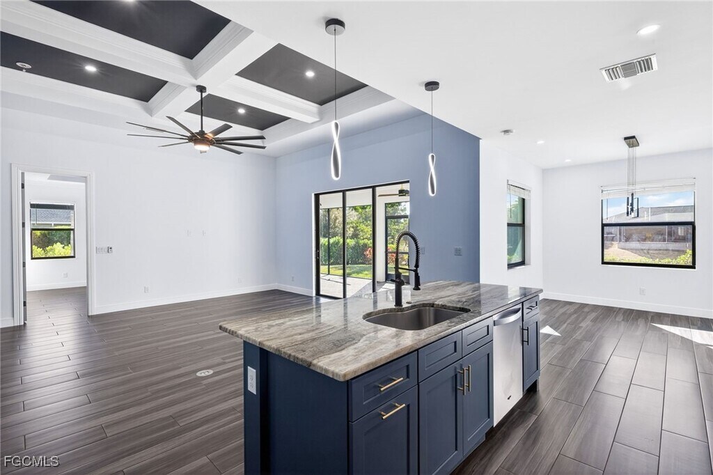 BEAUTIFULLY DESIGNED CUSTOM BUILT WATERFRONT HOME offering an OPEN CONCEPT LAYOUT with 3 BEDROOMS PLUS DEN,2 BATHROOMS,and a 3 CAR GARAGE. This home showcases SOARING CEILINGS RANGING FROM 10FT TO 14FT and has been FRESHLY PAINTED INSIDE AND OUTSIDE. Ideally located MINUTES FROM SHOPPING,RESTAURANTS,AND VETERANS PKWY,this property delivers both convenience and lifestyle. Enjoy DIRECT WATER ACCESS from your backyard,perfect for FISHING OR KAYAKING. The home welcomes you with a MAGNIFICENT FRENCH DOOR ENTRY and a STONE PAVER DRIVEWAY. Inside,you will immediately notice the attention to detail,including COFFERED CEILINGS WITH RECESSED LIGHTING,along with DESIGNER LIGHT FIXTURES AND FANS THROUGHOUT. The den features a CUSTOM BARN DOOR adding a unique touch. The kitchen and bathrooms are finished with BEAUTIFUL GRANITE COUNTERTOPS,and the kitchen is highlighted by a LARGE GRAY EAT IN ISLAND WITH CABINET STORAGE. The SPACIOUS PRIMARY SUITE offers a TRAY CEILING,HIS AND HERS WALK IN CLOSETS,and a luxurious bathroom featuring a FREESTANDING SOAKING TUB. Enjoy PICTURESQUE WATER VIEWS FROM MULTIPLE AREAS OF THE HOME. The backyard offers AMPLE SPACE FOR A POOL,and the lanai is already equipped with OUTDOOR KITCHEN HOOKUPS. This exceptional home truly offers PARADISE WATERFRONT LIVING