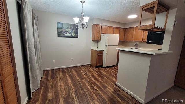 Luxurious, clean, newer paint throughout, corner unit, vaulted ceiling in the living room with large skylight. Fire place and balcony overlooking green area. Open kitchen includes peninsula that would fit a couple of bar stools. Large master with large walk in closet. Second bedroom also large with a walk in closet. Washer and dryer included. Central AC. Storage unit off the balcony. Outdoor pool and tenis court. Great area close to restaurants, and open space Bear Creek trail. Reserved parking spot #102. Quiet location, great condition. Small pet will be considered with additional pet rent and deposit. Great price for this beautiful condominium. Condominium MLS# 1985443