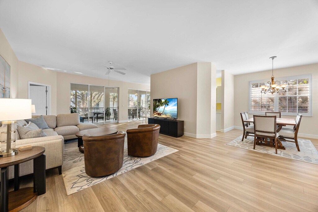 Lovely 2nd floor coach home with gorgeous lake views. Plenty of space in this over 2,100 sq. ft., 3-bedroom, 2-bath condominium overlooking a serene lake view with a glassed-in lanai that can be used as extra living space or opened up to enjoy Florida's warm breezes. Beautiful wood floors throughout, large flat screen TV in the living room, formal dining room and eat-in kitchen, King size bed and TV in the Primary Bedroom with glass doors leading to the lanai, garden tub and separate shower in the Primary Bathroom, Guest bedrooms are fitted with a Queen bed and Twin beds and TV's. Large ensuite laundry room and a 1-car garage Located within walking distance to Southbridge's community pool. Pelican Landing is a 2,365-acre gated community dedicated to preserving, protecting and enhancing the natural environment. Community amenities include a boat shuttle that provides transportation to and from a 34-acre gulf island Beach Park located at the northern tip of Big Hickory Island. Beach Park facilities include an elevated beach house with open decks, restrooms, shower facilities, nature library, beach bocce courts, open and screened picnic pavilions, beach chairs and umbrellas. The Community Center offers endless social activities and features a state-of-the-art 3,200 sq. ft. fitness center and 1,200 sq. ft. aerobics room. The Tennis Center has 12 har-tru courts (7 lighted) and a pro shop. Residents can enjoy private or group lessons or participate in one of the many scheduled events. Canoes and kayaks are available for residents use on Spring Creek, a tributary of Estero Bay, and Coconut Point Marina, which gives access to Estero Bay, Mound Key and the beaches.