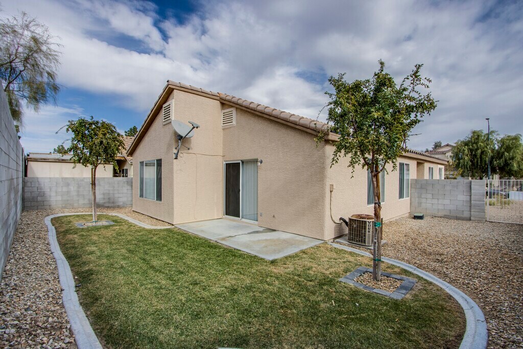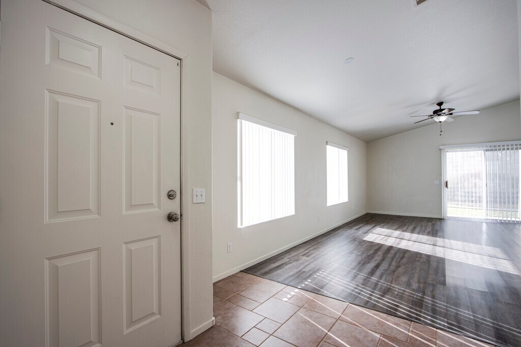 Single-story home with 3 bedrooms, 2 full baths, and a 2-car garage NO carpet— only tile and laminate flooring throughout. The kitchen shines with granite countertops and a dining area bathed in natural light from large windows. Once we secure a new tenant, this home will be upgraded with brand NEW kitchen appliances and a NEW washer & dryer—LUCKY YOU! The spacious living room includes a ceiling fan for added comfort and high ceilings! The primary bedroom is separated from the other bedrooms, features a ceiling fan, large walk in closet and primary bathroom has a separate tub and shower. Additional bedrooms are generously sized with ample closet space. The laundry room is a great size—perfect for all your washing needs! The backyard is a serene escape with grass, mature trees, and beautiful landscaping. Community park and trail for jogging. Enjoy easy access to freeways, shopping, dining, and more! Pet-friendly home with professional landscape maintenance (a value of $155/mont) is included in the rent!