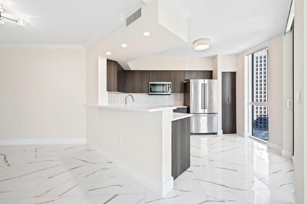 Vibrant city living at its finest enjoy front row views of the boat parade from your balcony. Completely remodeled features sleek white marble look porcelain tile throughout and a European inspired kitchen with modern cabinetry,marble countertops,and brand new stainless steel appliances. Elegant bathrooms boast LED lit mirrors and stylish finishes. upgrades include designer lighting,remote controlled blackout shades in the bedrooms,and custom closet buildouts. Enjoy multiple glass balconies off the kitchen,living room,& primary suite perfect for taking in the views. Full size washer & dryer included. Located in a full service building offering 5-star amenities: concierge,tropical pool deck with hot tub,gym,business center. Property hasn't been occupied since the remodel. AVAIL NOW MLS ID F10512539