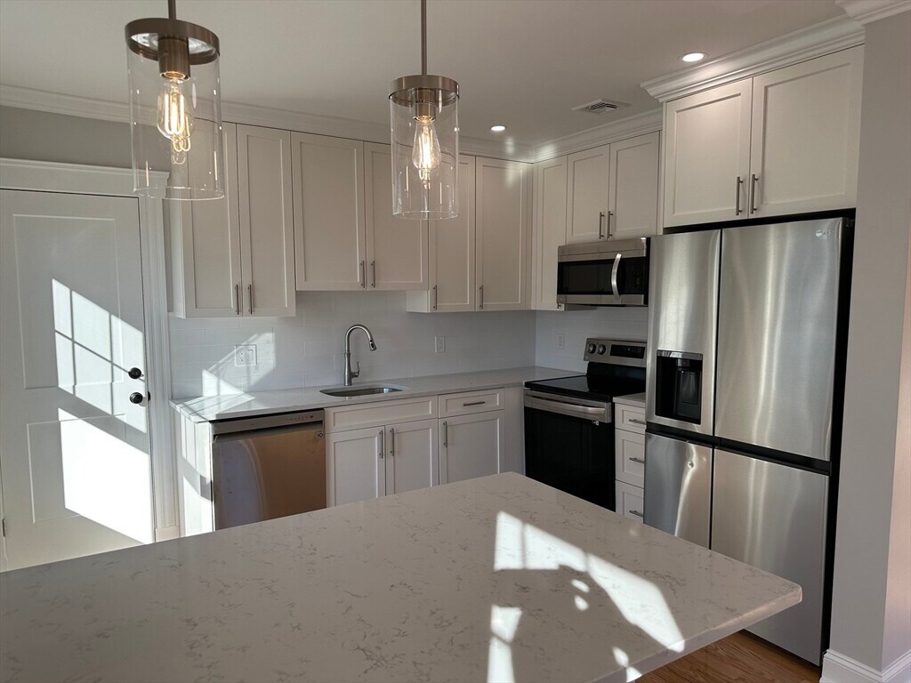 Beautifully renovated multi-level apartment with three bedrooms and three full bathrooms. Complete exterior and interior renovations with an in-unit Washer/Dryer,hardwood floors,beautiful woodwork throughout,1 garage space plus 1 driveway space and a large balcony! Highly convenient location on Trapelo Road right across the street from Oakley Country Club with beautiful views of the golf course! Plenty of nearby amenities including the #73 bus into Harvard Square and Boston. Central Air,gas heat,spacious bedrooms with primary en-suite bath,s/s appliances,quartz counters and private storage space in the basement! Available 7/1! MLS# 73502228
