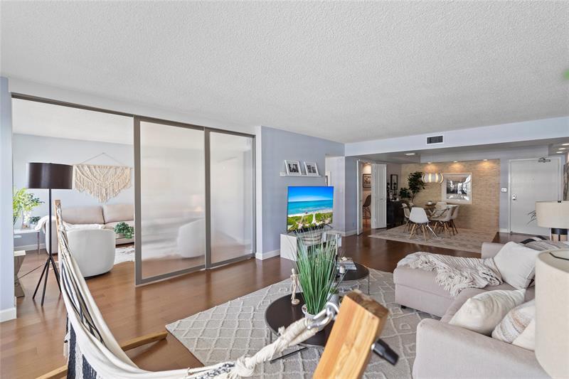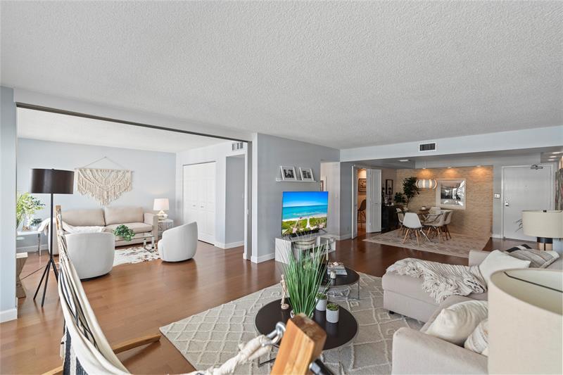 Enjoy all that beach living has to offer in a 2-bedroom 2-bath unit with spectacular ocean views from the 16th floor of Playa del Sol. The second bedroom can be seamlessly connected to the living area via new retractable sliding glass doors. An open layout extends your view of the surf. With upgraded balcony, impact windows and hardwood floors throughout; the 1,435 sq. ft. unit offers a spacious kitchen, separate dining area, washer/dryer and master bedroom with walk-in closet and luxurious vanity area. All of your needs are met in a building with direct beach access, a stunning heated pool, garage parking, new lobby with 24-hour doorman, game room, community/party room, 2 gyms and a management office onsite. In the heart of Galt Ocean Mile you are close to restaurants and shopping.