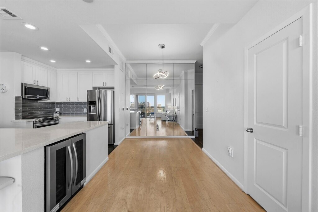 Beautifully upgraded 2 bedroom,2 bathroom condo on the 19th floor of The Mark in the heart of the Galleria with stunning skyline and pool views. Spacious balcony accessible from the living room and both bedrooms,each with custom insect screens. Interior features include quartz countertops,custom cabinetry,stainless steel appliances,wine fridge,wood flooring,upgraded lighting and fans,LG washer and dryer,Nest thermostat,and modern finishes throughout. Full-service building with concierge,resort-style pool,fitness center,and a prime location near premier shopping,dining,and major highways. MLS# 66416832