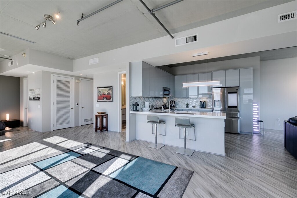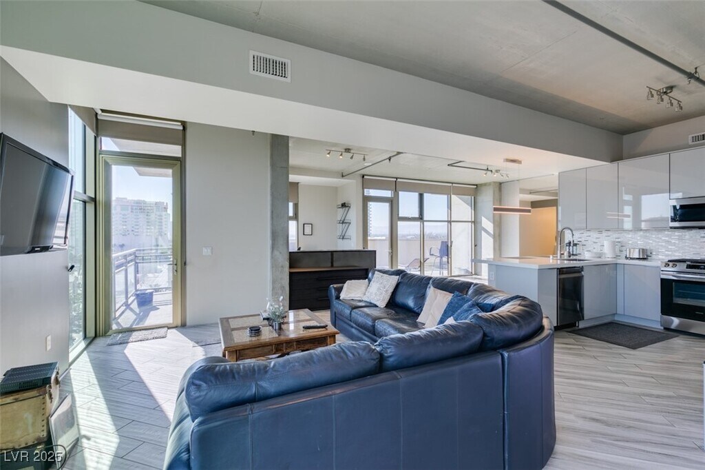Welcome to your stylish retreat in the vibrant Art's District Downtown Las Vegas! New Years Special, 1 month free on 12 month lease if move in by 12/31/25! This beautifully furnished condo combines modern design with eclectic charm, offering the perfect balance of comfort & personality. The open living area boasts floor to ceiling windows & 10 foot ceilings flooding the home with natural light. Panoramic city and mountain views throughout the condo and from the large private balcony off of the main living area. Kitchen has breakfast bar & granite counters, stainless appliances. Sectioned off bedroom area & walk in closet. Washer & dryer included. Experience the Amenities of Luxury High Rise Living with 24 hour Concierge, Two Level Fitness Center, Resort Style Pool and Spa with Cabanas, Secure Building Access, Outdoor movie theater & lounge area, and Garage Parking included! Enjoy local restaurants, coffee shops, galleries & nightlife just steps away at Arts District, Move right in!