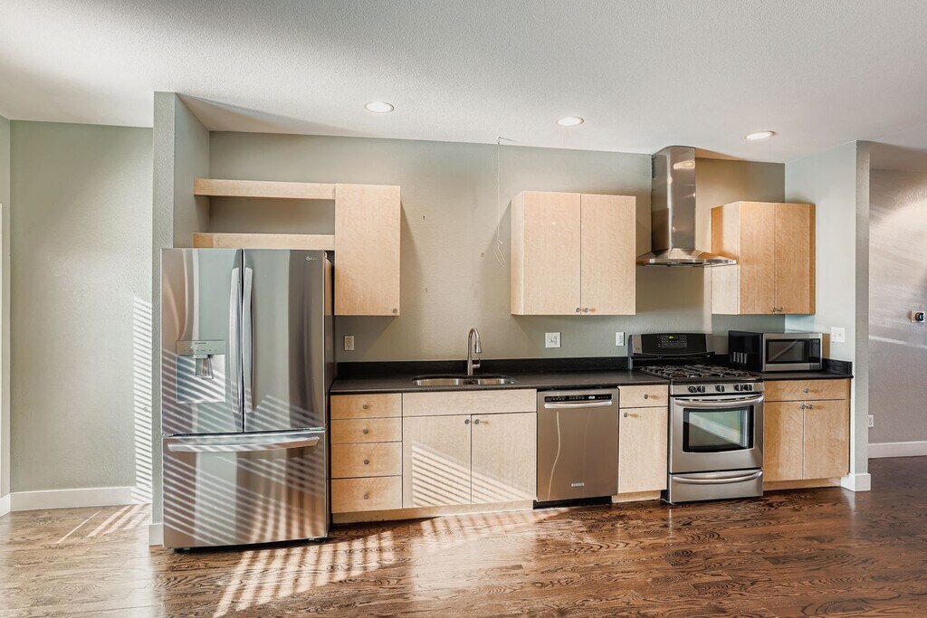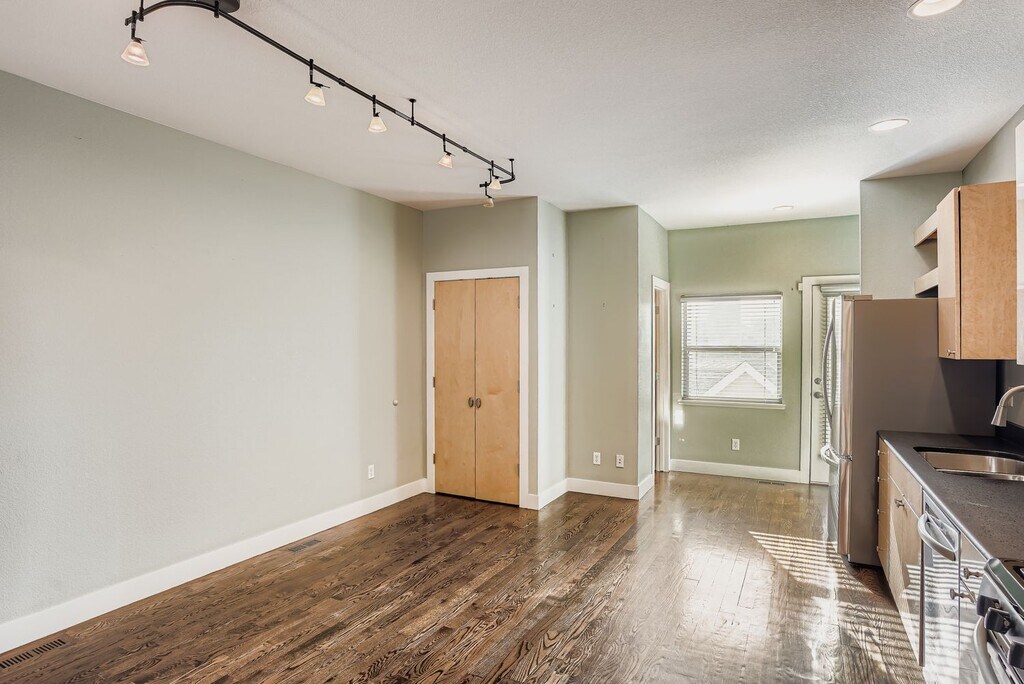 Welcome to this stylish urban contemporary townhome in the heart of Baker RIGHT ON DAILEY PARK. Designed for modern living, the main living space is located on the upper level and features a dramatic glass-panel garage door that opens to a private balcony overlooking Dailey Park, creating a seamless indoor-outdoor experience and peaceful park views. The open-concept kitchen offers maple cabinetry, granite countertops, and stainless steel appliances, while newer hardwood floors run throughout the upper level, adding warmth and polish. The main level includes two spacious bedrooms, each with its own full bathroom! The primary bedroom is tucked away at the back of the home and includes a private door to the rear patio. Full-size laundry is conveniently located on the main floor. Additional highlights include a two-car garage, easy access to public transportation and major highways, and a walkable location close to Baker's restaurants, coffee shops, and nightlife. BRAND NEW WASHER DRYER IN UNIT, EXTRA STORAGE IN GARAGE FOR ALL COLORADO GEAR!