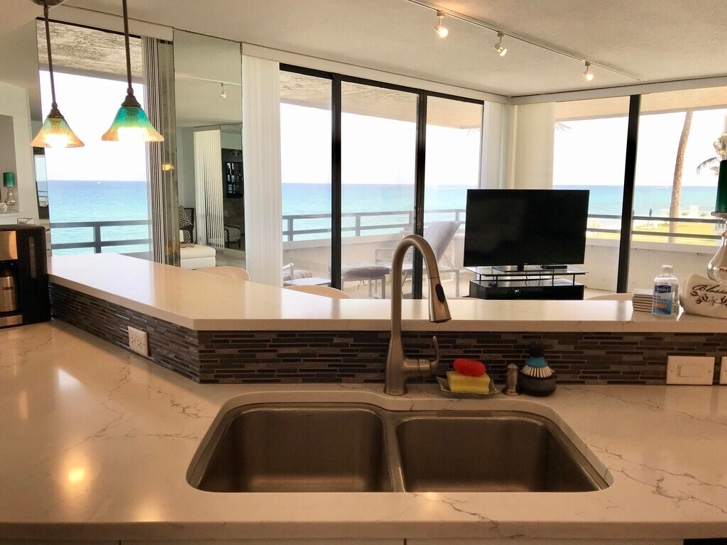 Enjoy all that Palm Beach has to offer. Direct ocean views from this large 3 bedroom floor plan that has been opened to a 2 bedroom and a den. Look out upon stunning views from your recently renovated southeast facing unit and master suite with a veranda style wrap around balcony. Enjoy the sound of the waves and spectacular sunrises all season long. Unit has porcelain tiles thruout,bar dining next to the eat-in kitchen,wine cooler,wet bar & full size washer/dryer. Amenities include fitness room,oceanfront pool,covered parking & door person. Also available off season MLS ID R11081242