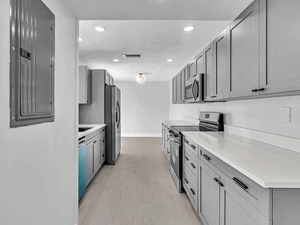 This stunningly renovated lakefront townhome with courtyard & storage area will be your retreat from your busy work week. You will be swept away by the modern aesthetic, crown molding, porcelain wood plank tile floors & abundance of natural light. Home chefs will enjoy the gourmet kitchen with slow-close Shaker wood cabinets, Quartz countertops, LED matte black spray faucet, deep matte black sink & brand-new Stainless-Steel appliances. The master features a renovated bath with a rainfall shower & large format porcelain tile. Home includes Samsung front loading washer/dryer. Pet friendly association includes water & sewer. Nestled in sought after community of Welleby, this home is walking distance from the Sunrise Tennis Club & close to amazing restaurants & shopping at Sawgrass Mills mall.