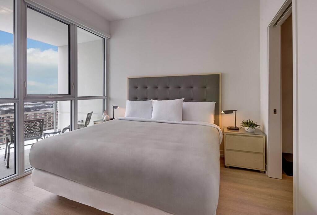 Feel at home in this sophisticated apartment in River North, a hub for arts and entertainment. This spacious apartment offers accommodations ranging from studios to 2-bedroom options. This executive suite offers a fully equipped gourmet kitchen, in-suite laundry, and high-speed Wi-Fi. Floor-to-ceiling windows boast remarkable city views from the private balcony. Guests have access to over 30,000 sq ft of unrivaled lifestyle amenities including a rooftop pool with cabanas, an outdoor bocce court, a fitness center, a dog run, and a co-working space. Relax on a Hypnos® mattress carefully selected and strategically paired with high thread-count linens, a hypoallergenic duvet, and pillows. Additional amenities include a flat-screen smart TV with cable, air conditioning, an in-suite workspace, and a deep soaking tub or walk-in shower. On-site self-parking is available for an additional fee. Pets are welcome with a $150 one-time fee and a $5 daily fee for each pet. River North is the go-to district for art and design lovers, bursting with energy and an array of fabulous art galleries and history-defining buildings. The best shopping in Chicago is minutes away at The Magnificent Mile, the Loop business district is just across the river, and plenty of fresh air and green space can be found riverside. The dining scene is always buzzing, and River North is also home to many significant architectural standouts. No parties are allowed. [SI]