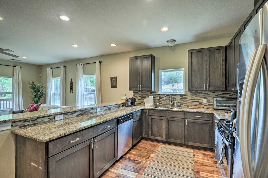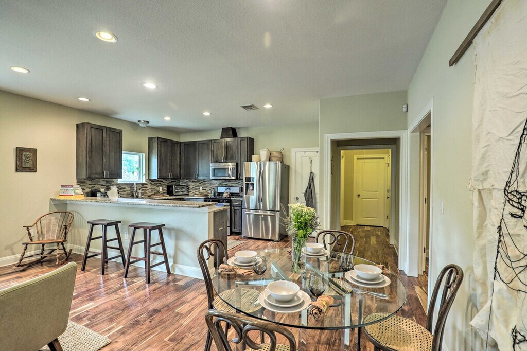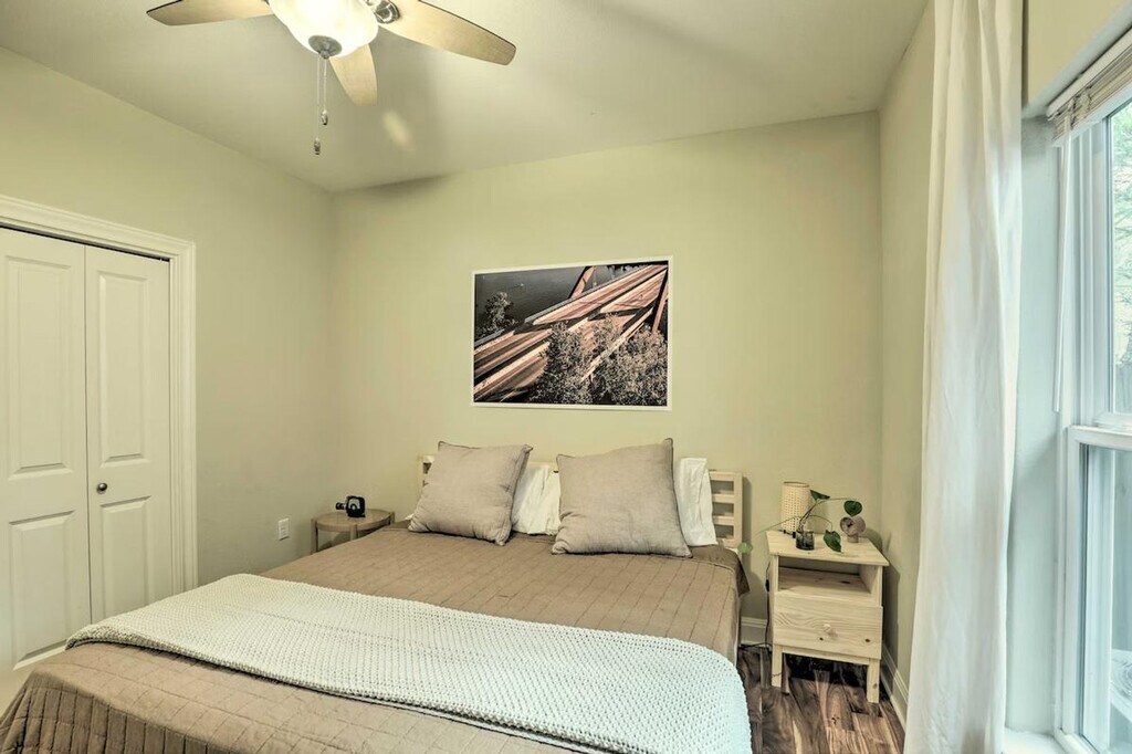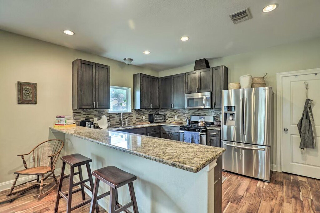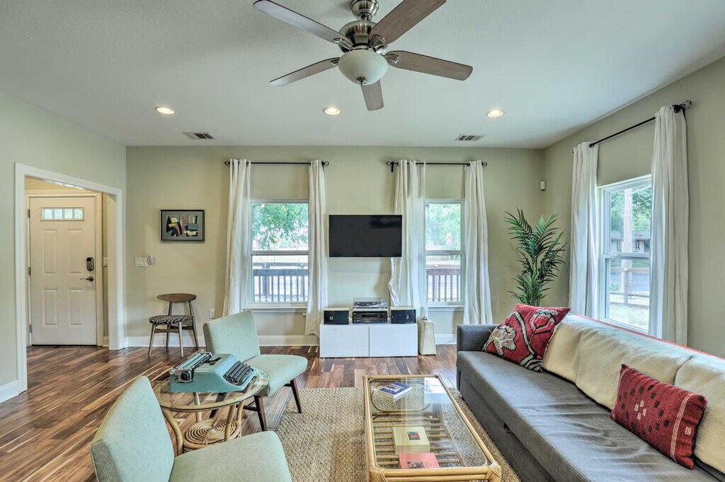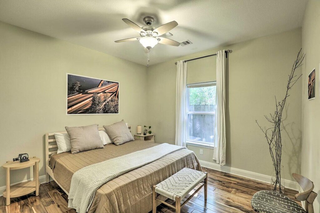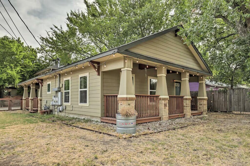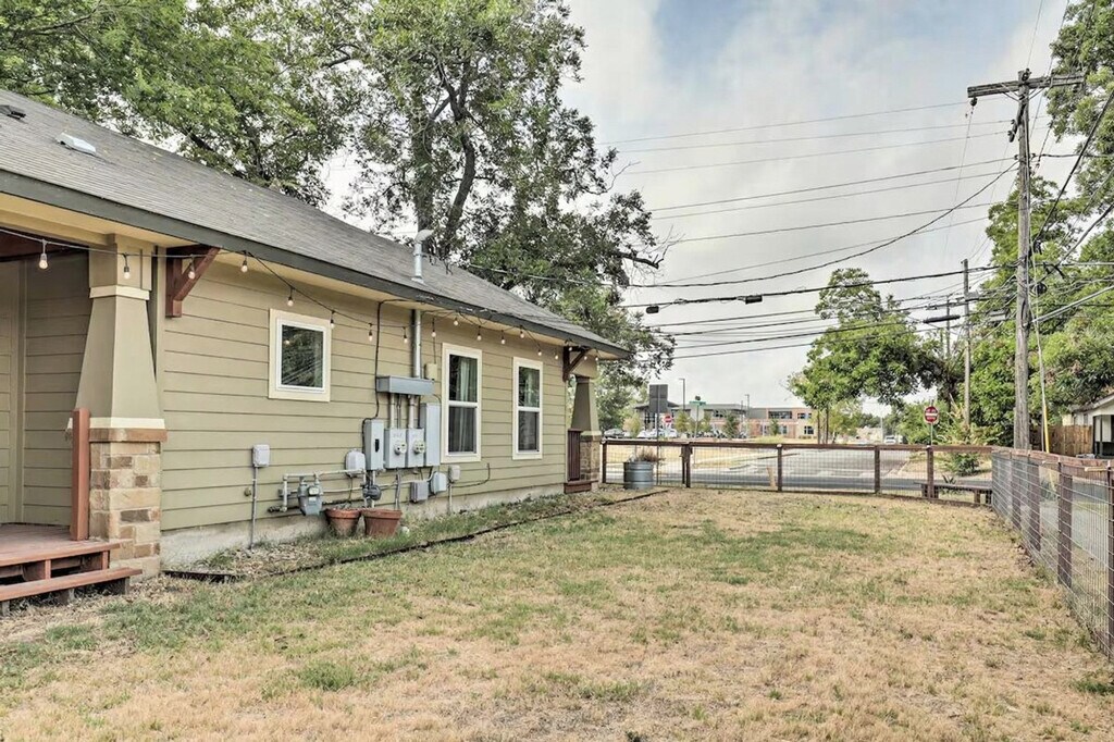 Feel at home in this Austin vacation rental, the perfect home base for your group. This property features 2 bedrooms and 1 bathroom. This 1,500-square-foot apartment features an open floor plan and in-unit laundry. The kitchen is equipped with a dishwasher, refrigerator, oven with 4-burner stovetop, microwave, island with seating, French press coffee maker, coffee grinder, tea kettle, toaster oven, cooking basics, dishware, and flatware. Entertainment options include smart TVs, board games, and books. Complimentary toiletries, a hair dryer, and hangers are provided. Enjoy the convenience of free Wi-Fi and central heating and A/C. Parking is available in the shared driveway for up to 3 vehicles, and free street parking is also available. You'll love the large fenced yard and proximity to Downtown Austin’s selection of bars, eateries, and live music joints. Explore the walking trails around Ladybird Lake or rent a kayak for a different perspective. There is another bookable vacation rental on-site, and the driveway is shared with this unit, so other travelers may be present during your stay. Smoking, pets, events, parties, and large gatherings are not allowed. [SI]